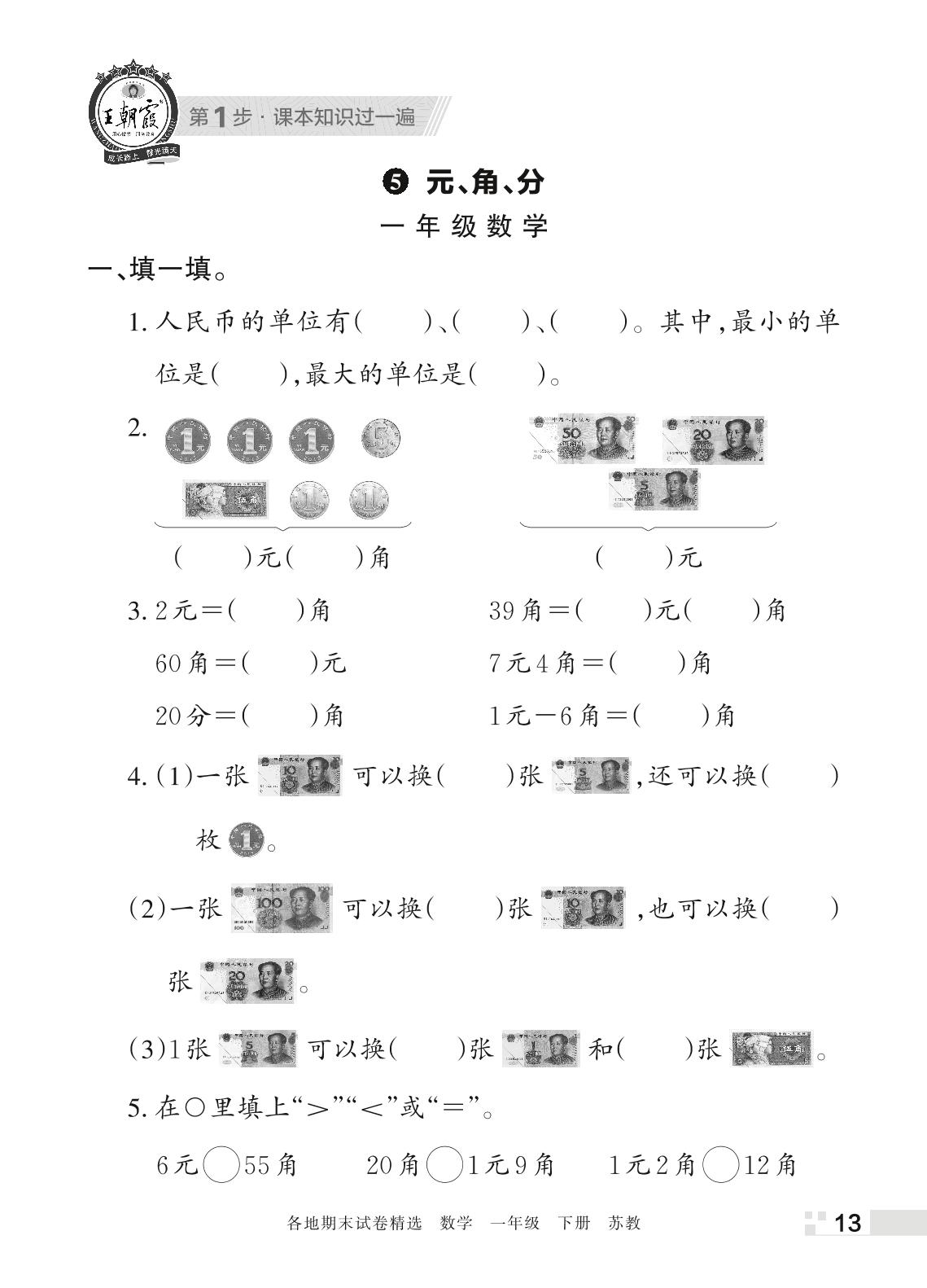 王朝霞期末过课本——5 元、角、分一年级下册数学(苏教版)