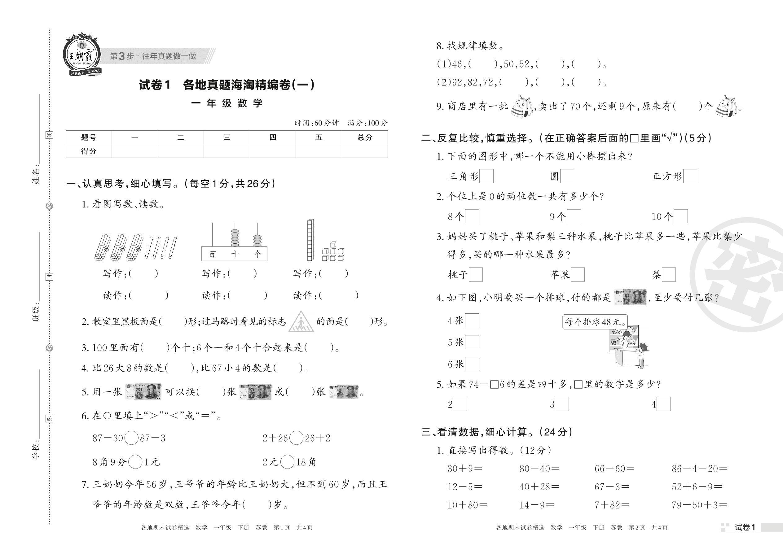 一年级数学苏教版下册期末卷