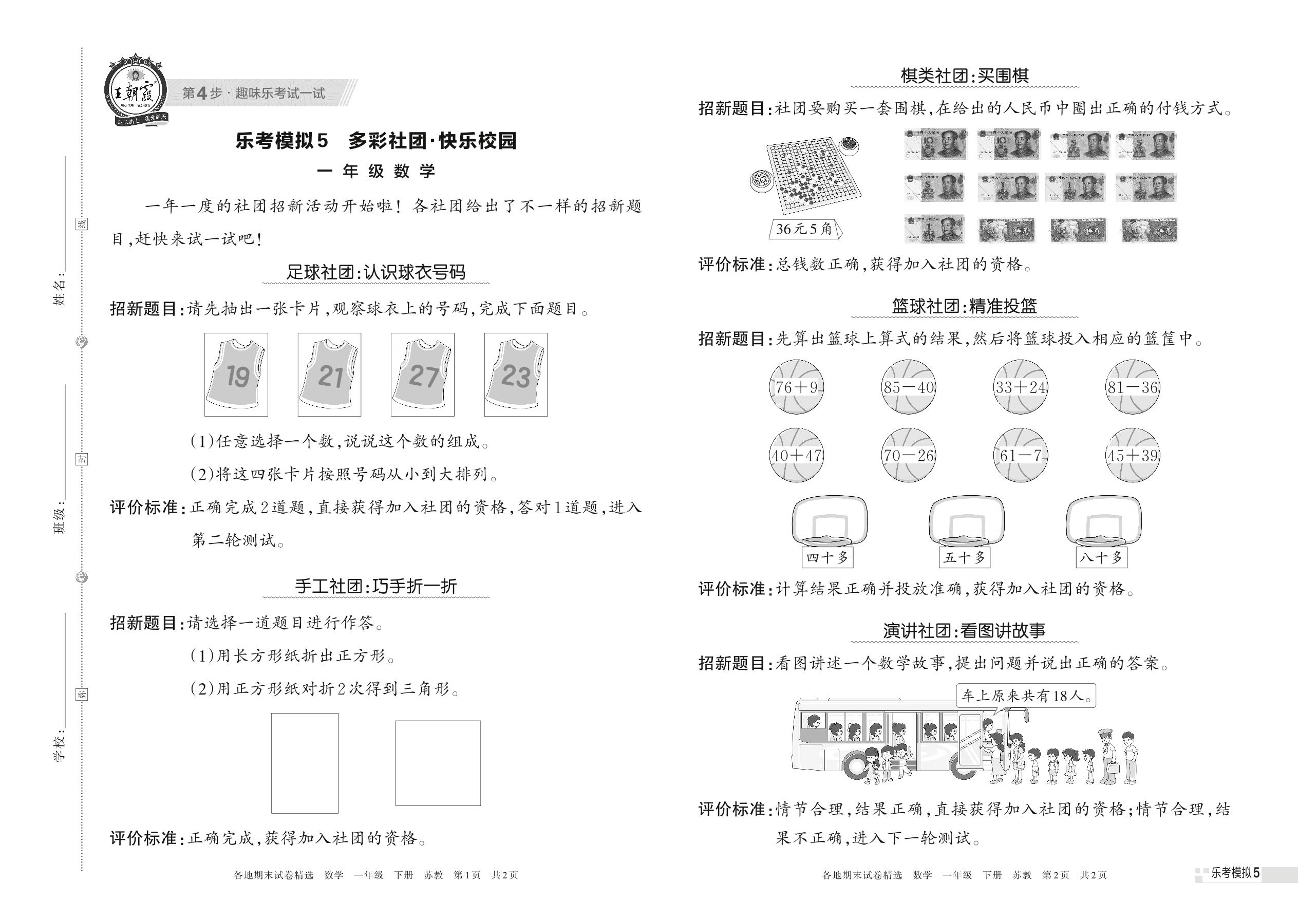 乐考模拟5 多彩社团·快乐校园一年级下册数学(苏教版)