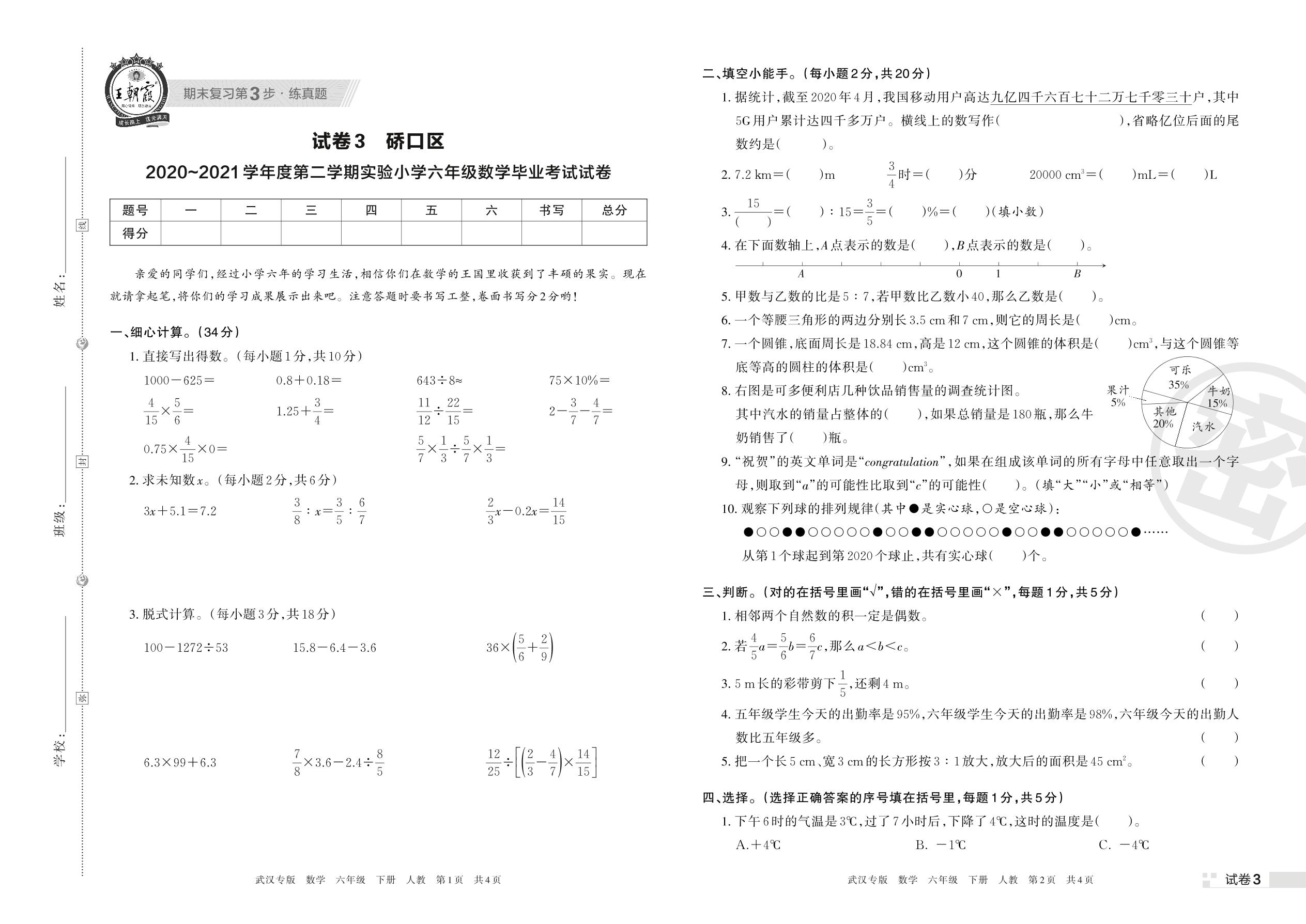 硚口区2020~2021学年度第二学期实验小学六年级数学毕业考试试卷(人教版)【3】