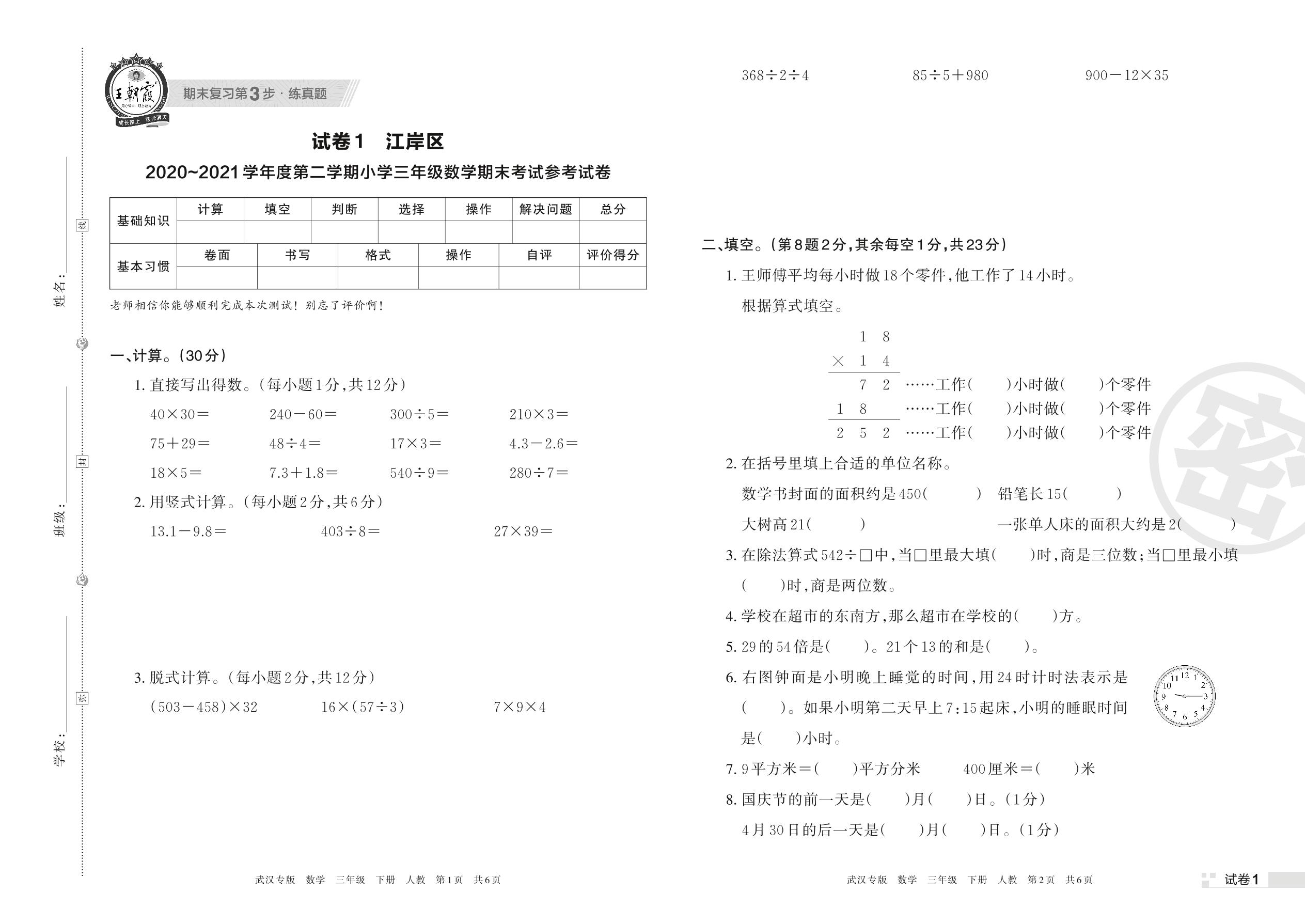 江岸区2020~2021学年度第二学期小学三年级数学期末考试参考试卷(人教版)【1】