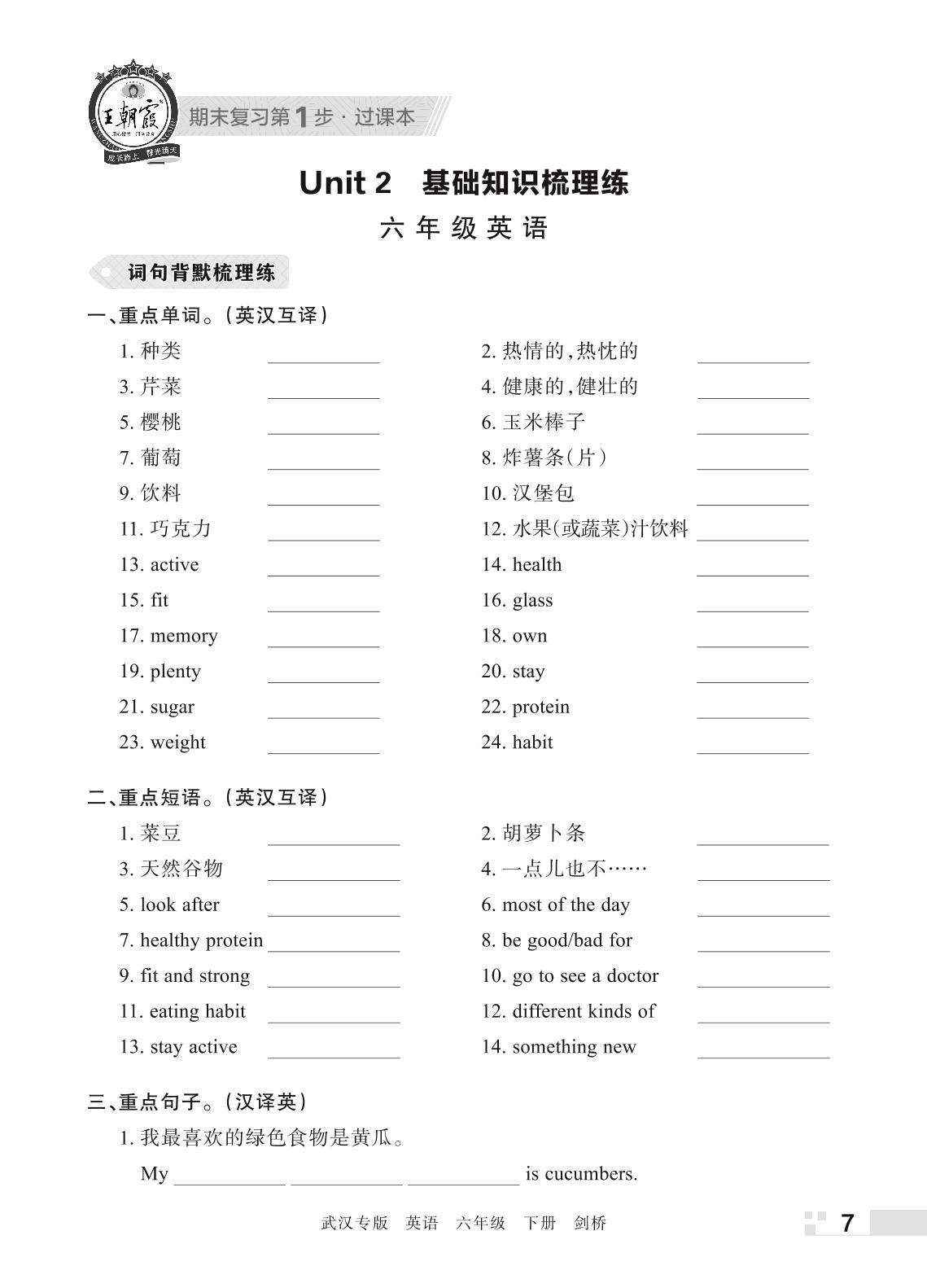 王朝霞期末过课本——Unit 2 基础知识梳理练六年级下册英语(剑桥版)