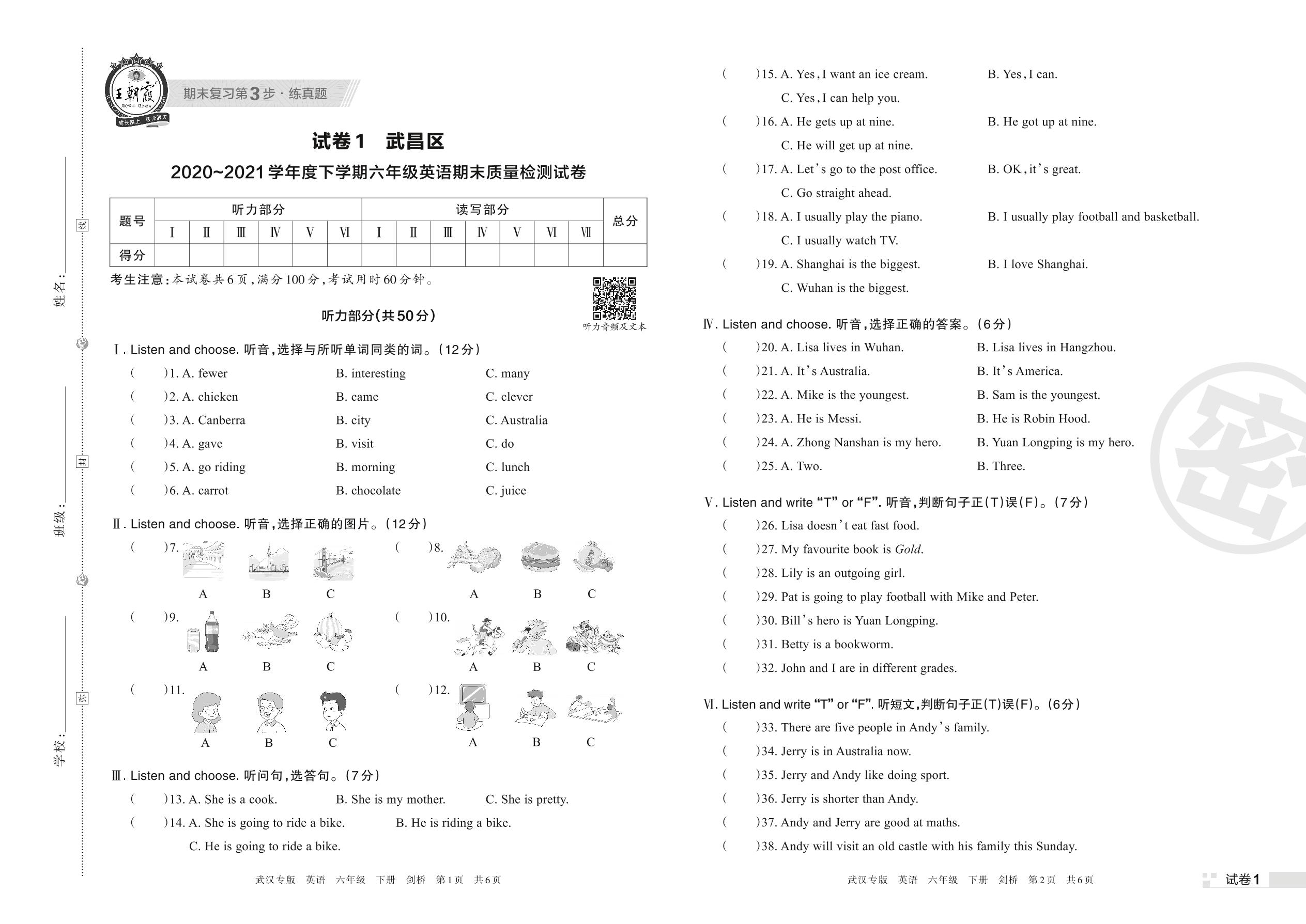 武昌区2020~2021学年度下学期六年级英语期末质量检测试卷(剑桥版)【1】