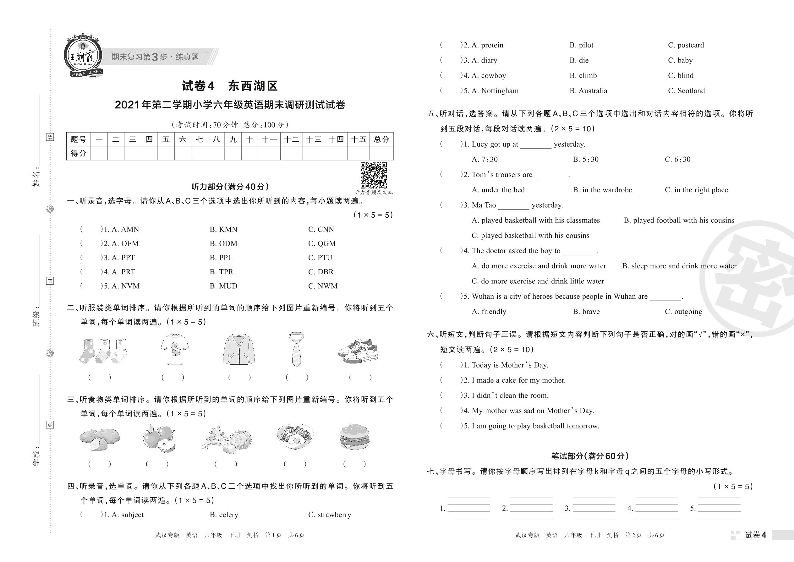 东西湖区2021年第二学期小学六年级英语期末调研测试试卷(剑桥版)【4】