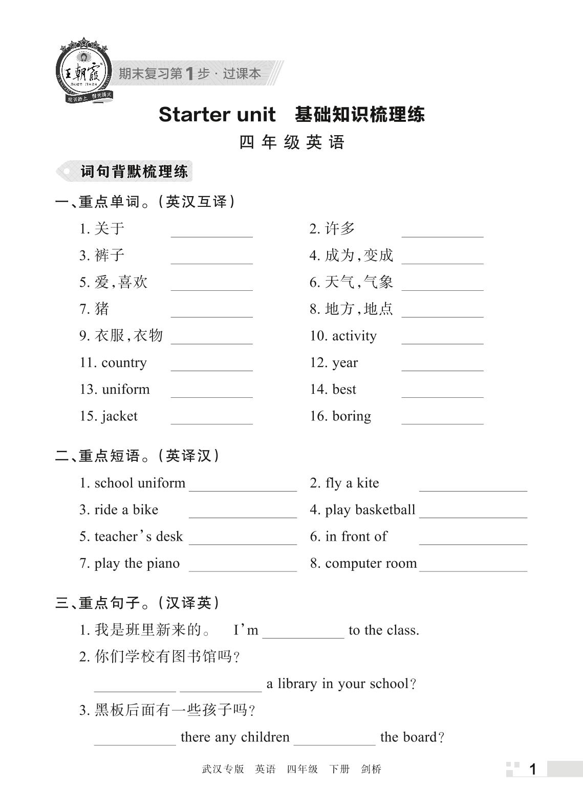 王朝霞期末过课本——Starter unit 基础知识梳理练四年级下册英语(剑桥版)