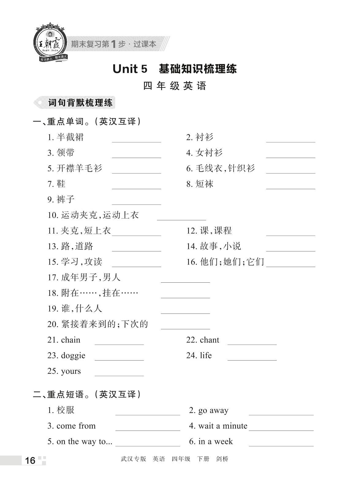 王朝霞期末过课本——Unit 5 基础知识梳理练四年级下册英语(剑桥版)