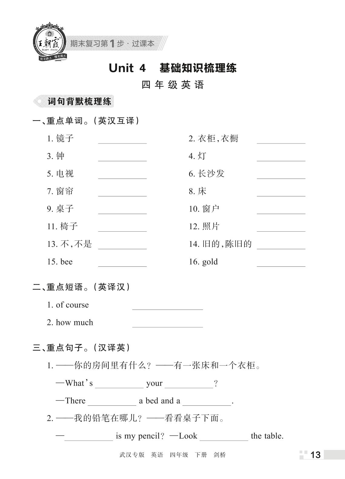 王朝霞期末过课本——Unit 4 基础知识梳理练四年级下册英语(剑桥版)