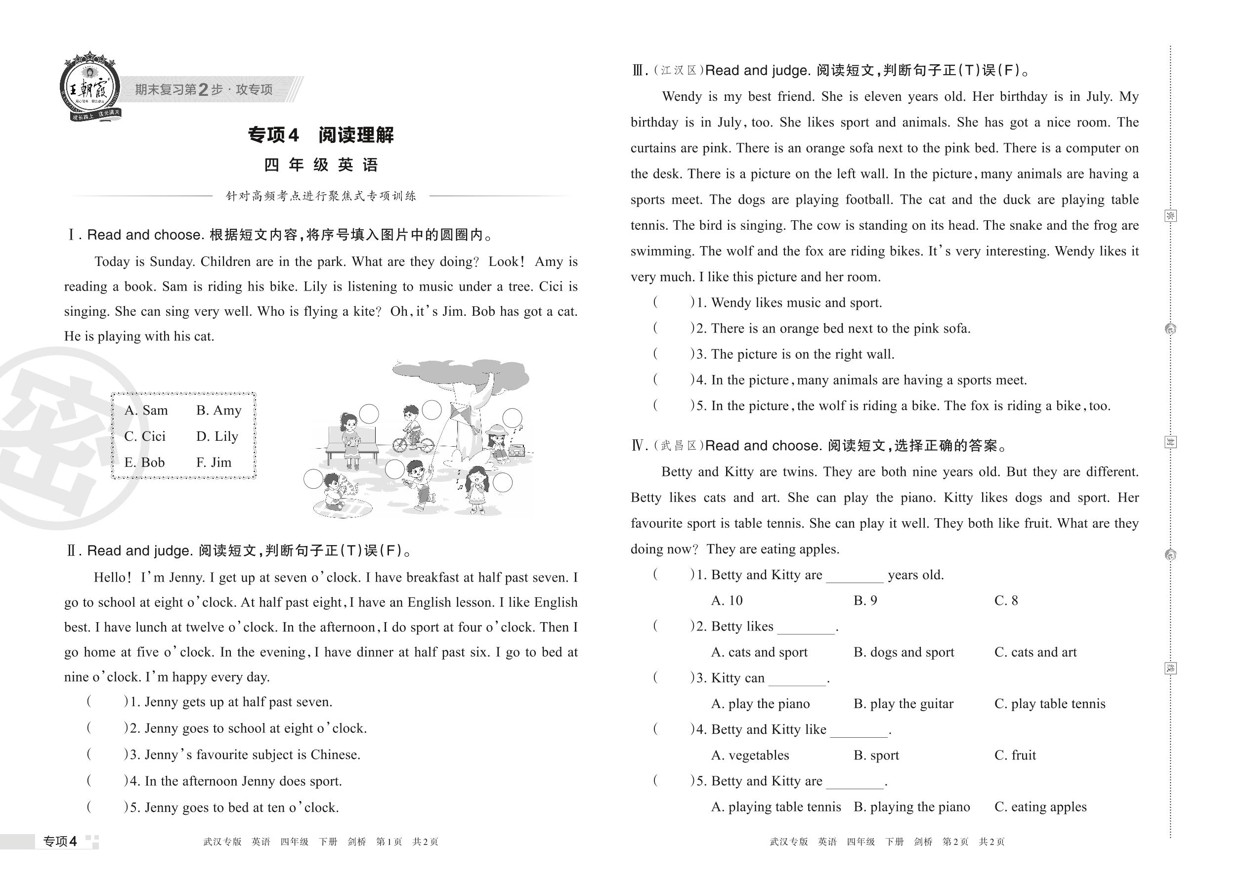 王朝霞期末专项卷——阅读理解四年级下册英语(剑桥版)【4】