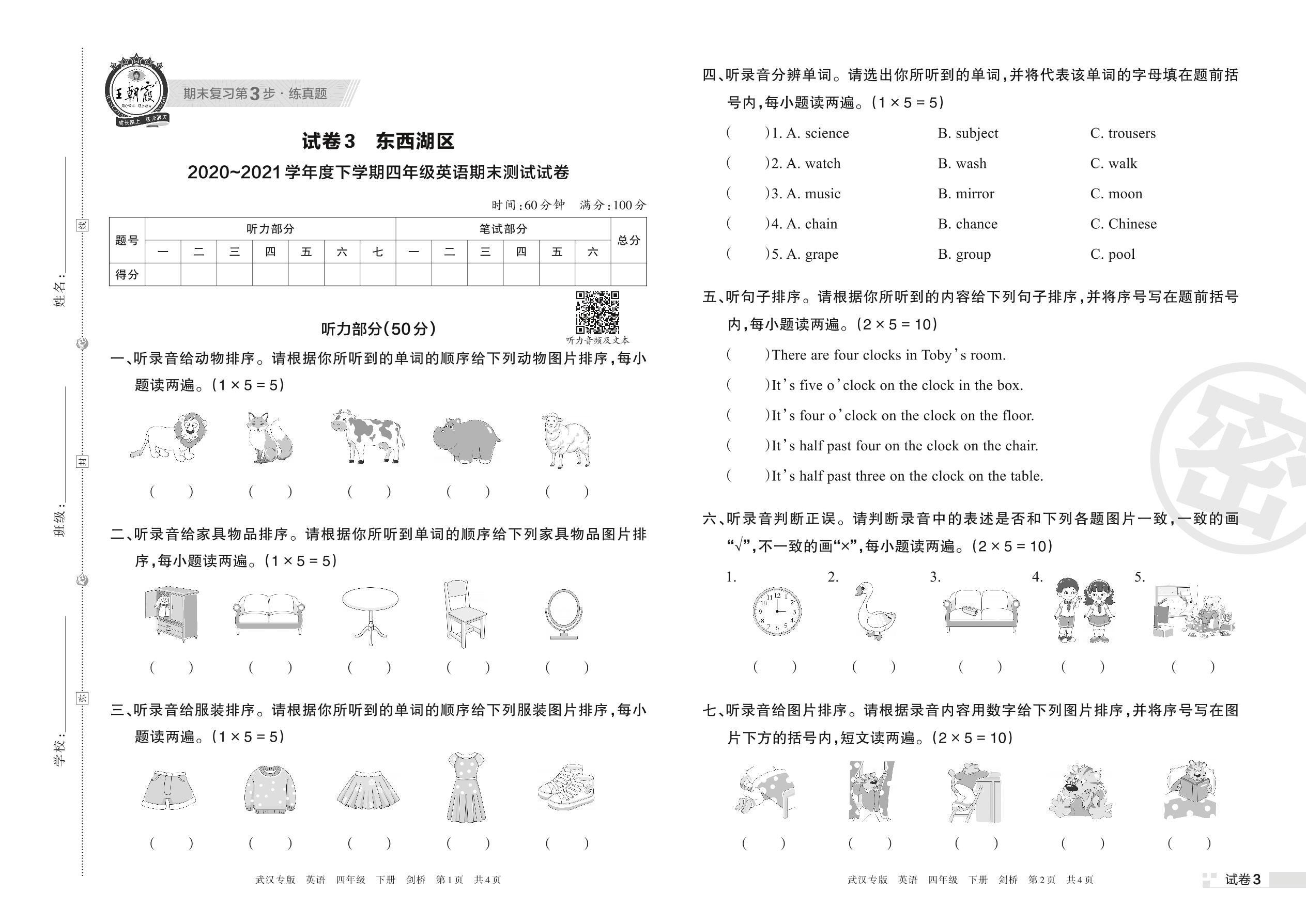 东西湖区2020~2021学年度下学期四年级英语期末测试试卷(剑桥版)【3】