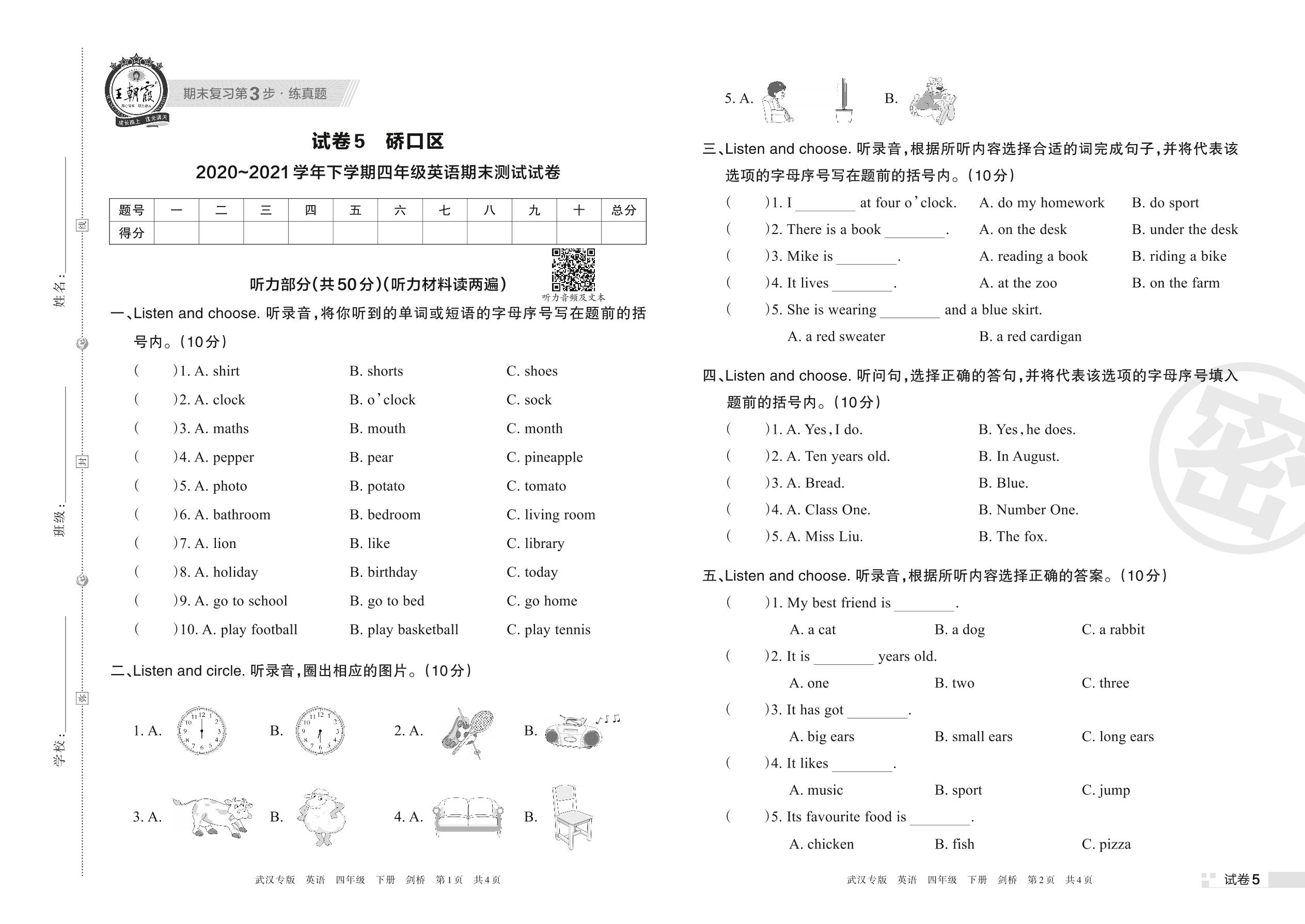 硚口区2020~2021学年下学期四年级英语期末测试试卷(剑桥版)【5】