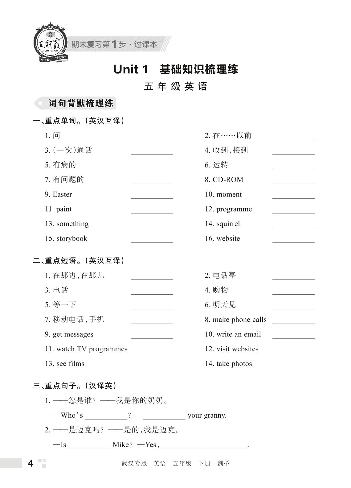 王朝霞期末过课本——Unit 1 基础知识梳理练五年级下册英语(剑桥版)