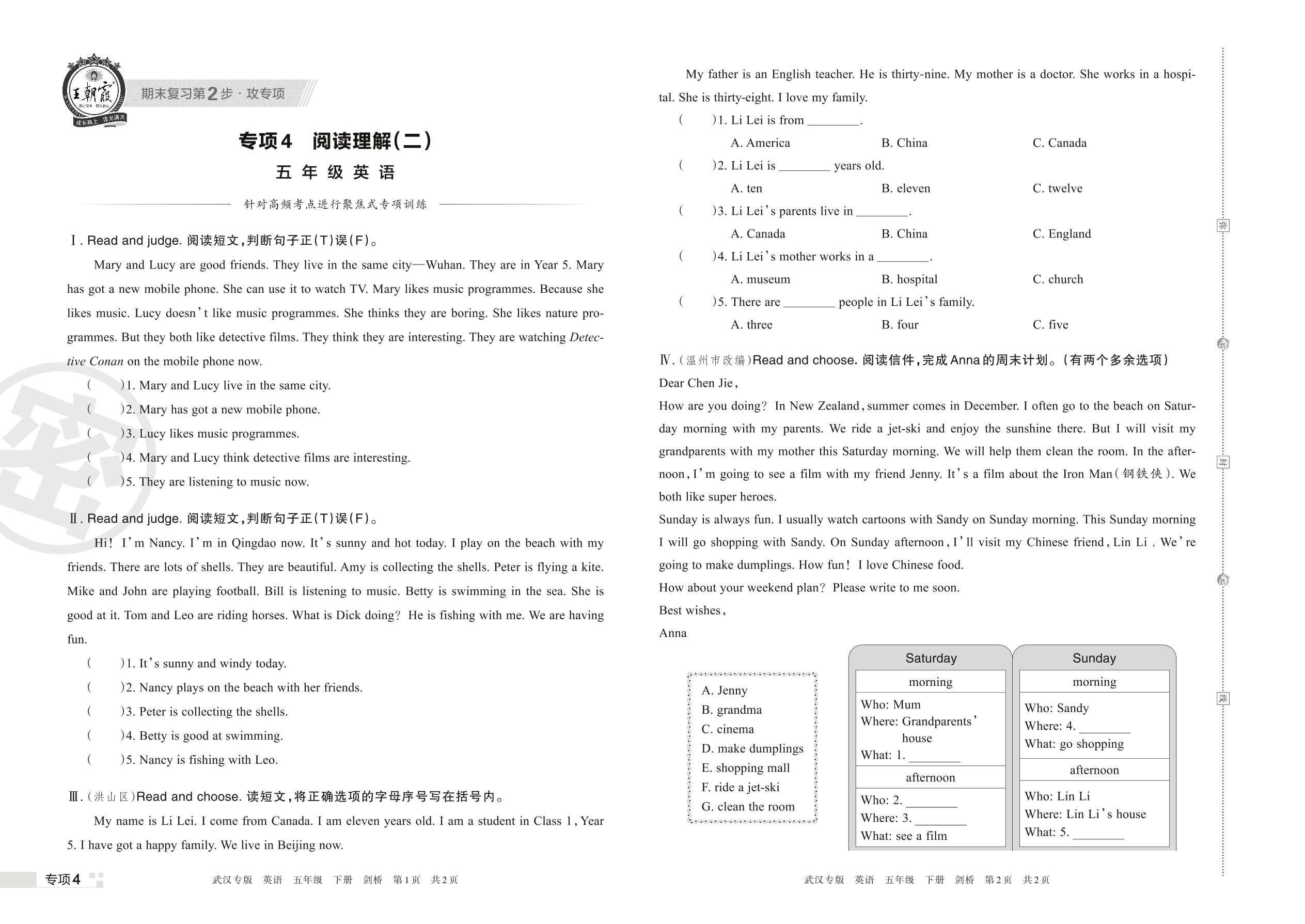 王朝霞期末专项卷——阅读理解(二)五年级下册英语(剑桥版)【4】