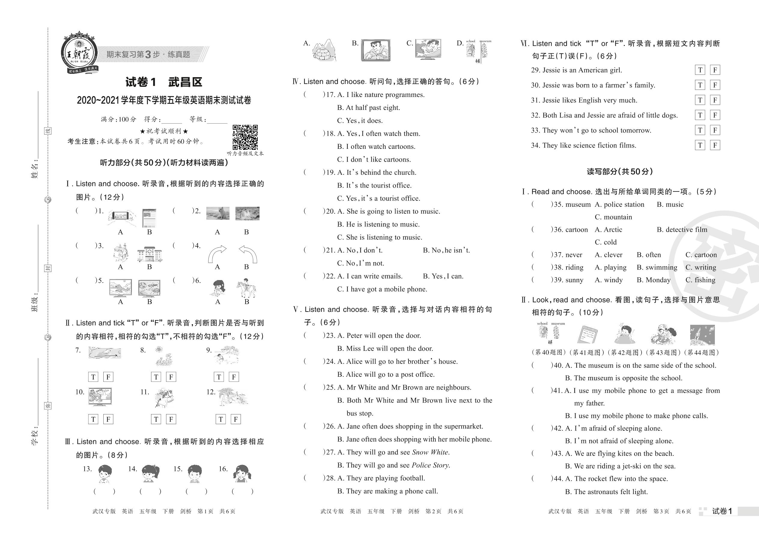 武昌区2020~2021学年度下学期五年级英语期末测试试卷(剑桥版)【1】