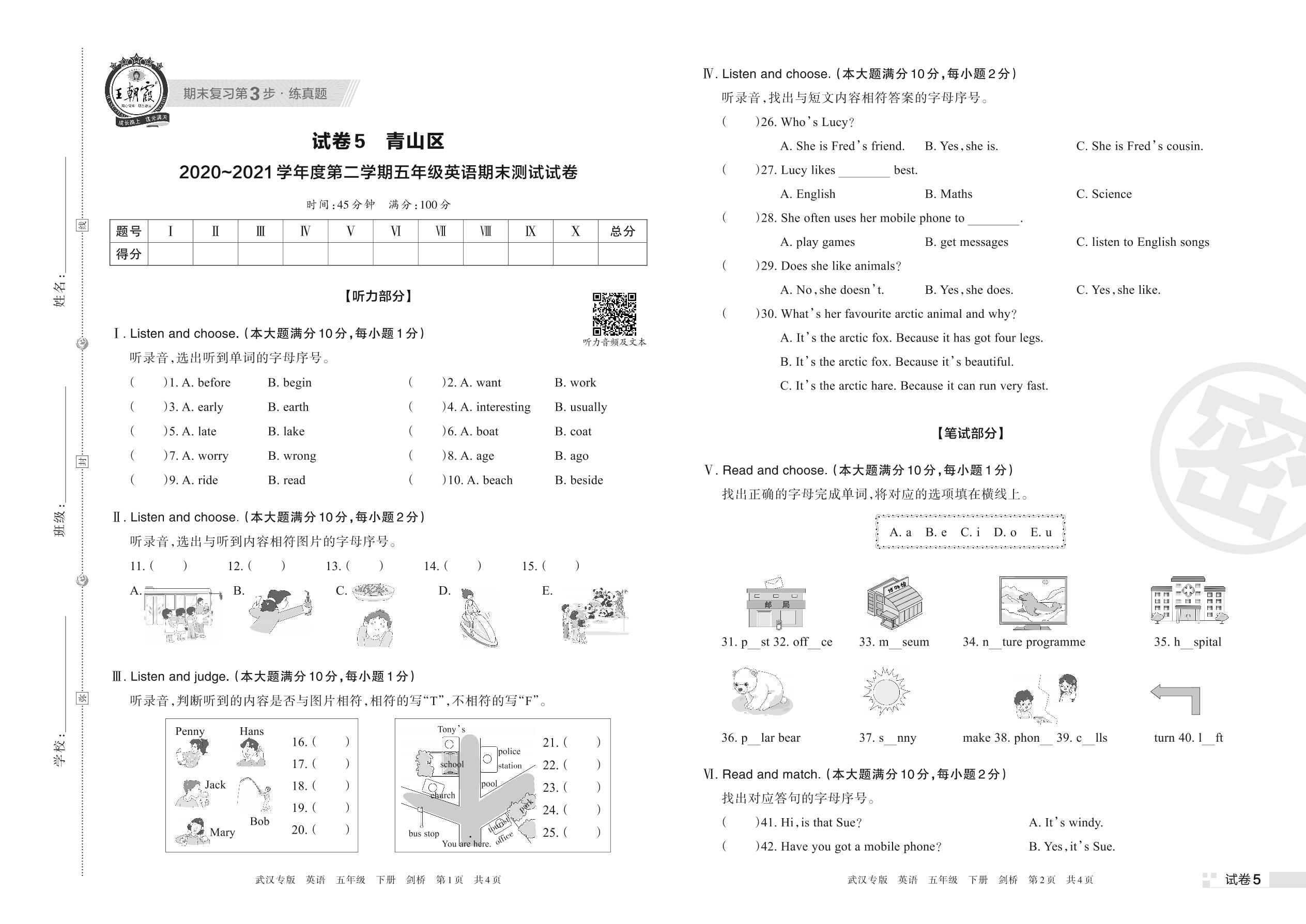 青山区2020~2021学年度第二学期五年级英语期末测试试卷(剑桥版)【5】