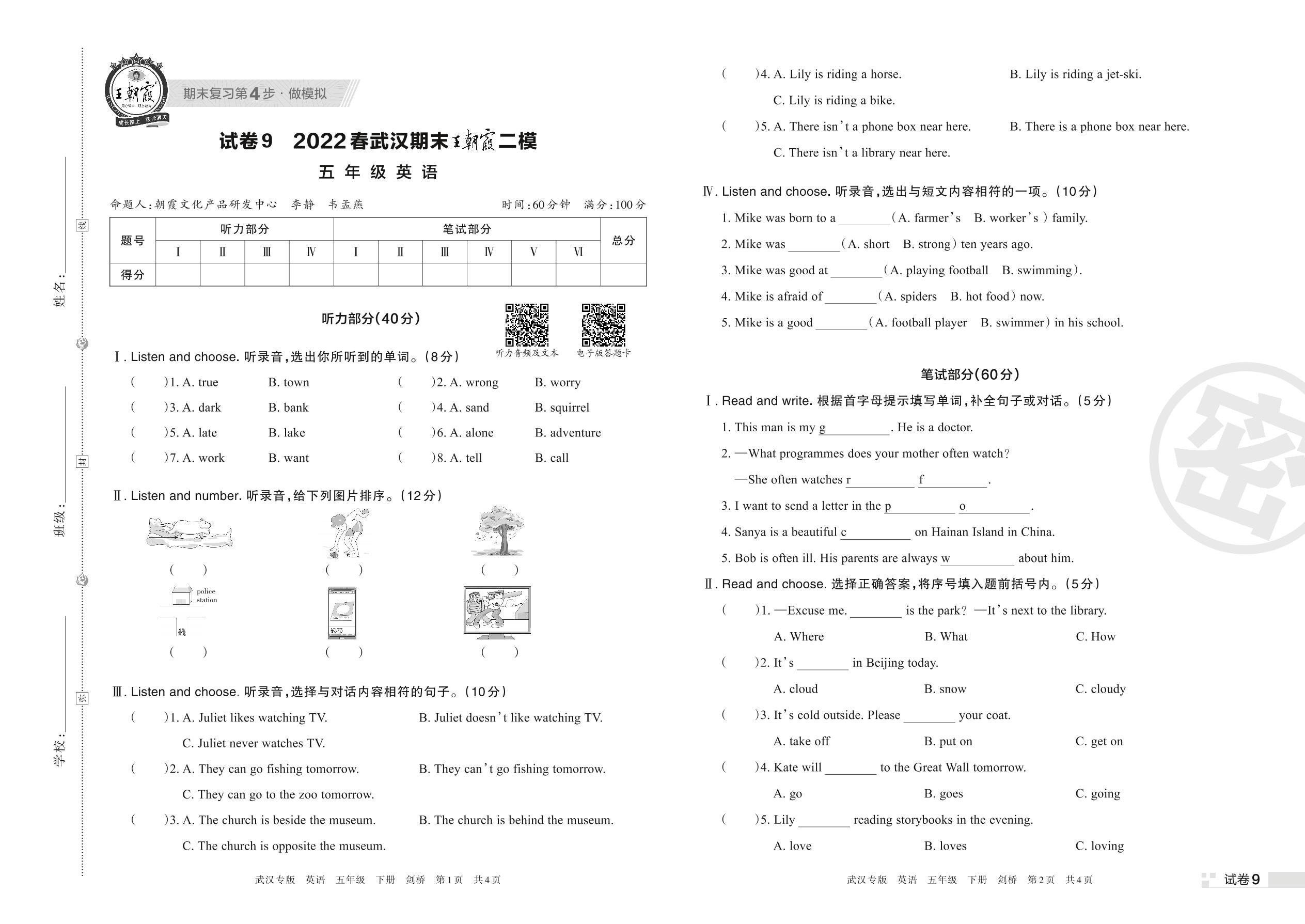 王朝霞期末模拟卷五年级下册英语(剑桥版)【9】