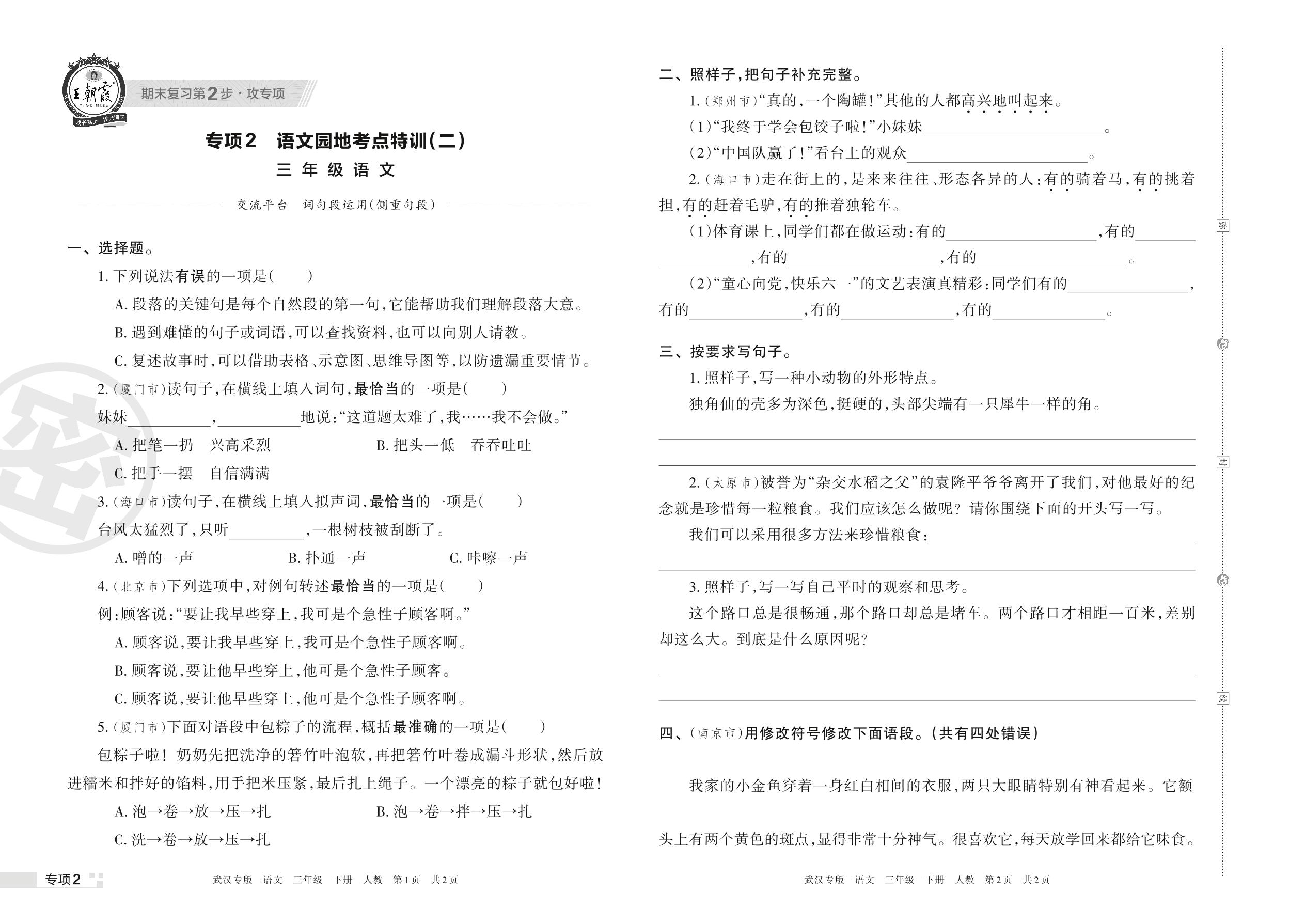 王朝霞期末专项卷——语文园地考点特训(二)三年级下册语文(人教版)_R220409171040604【2】
