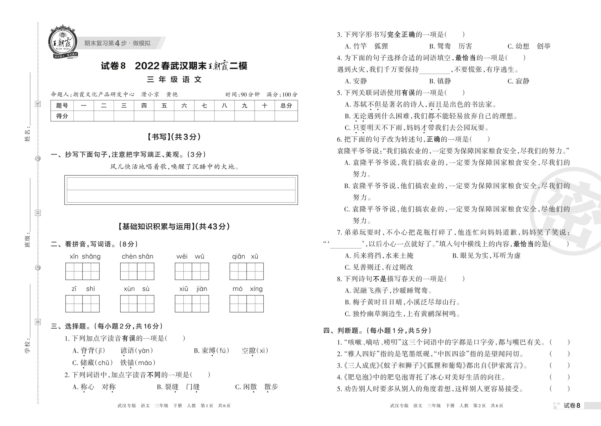 王朝霞期末模拟卷三年级下册语文(人教版)_R220409171041463【8】
