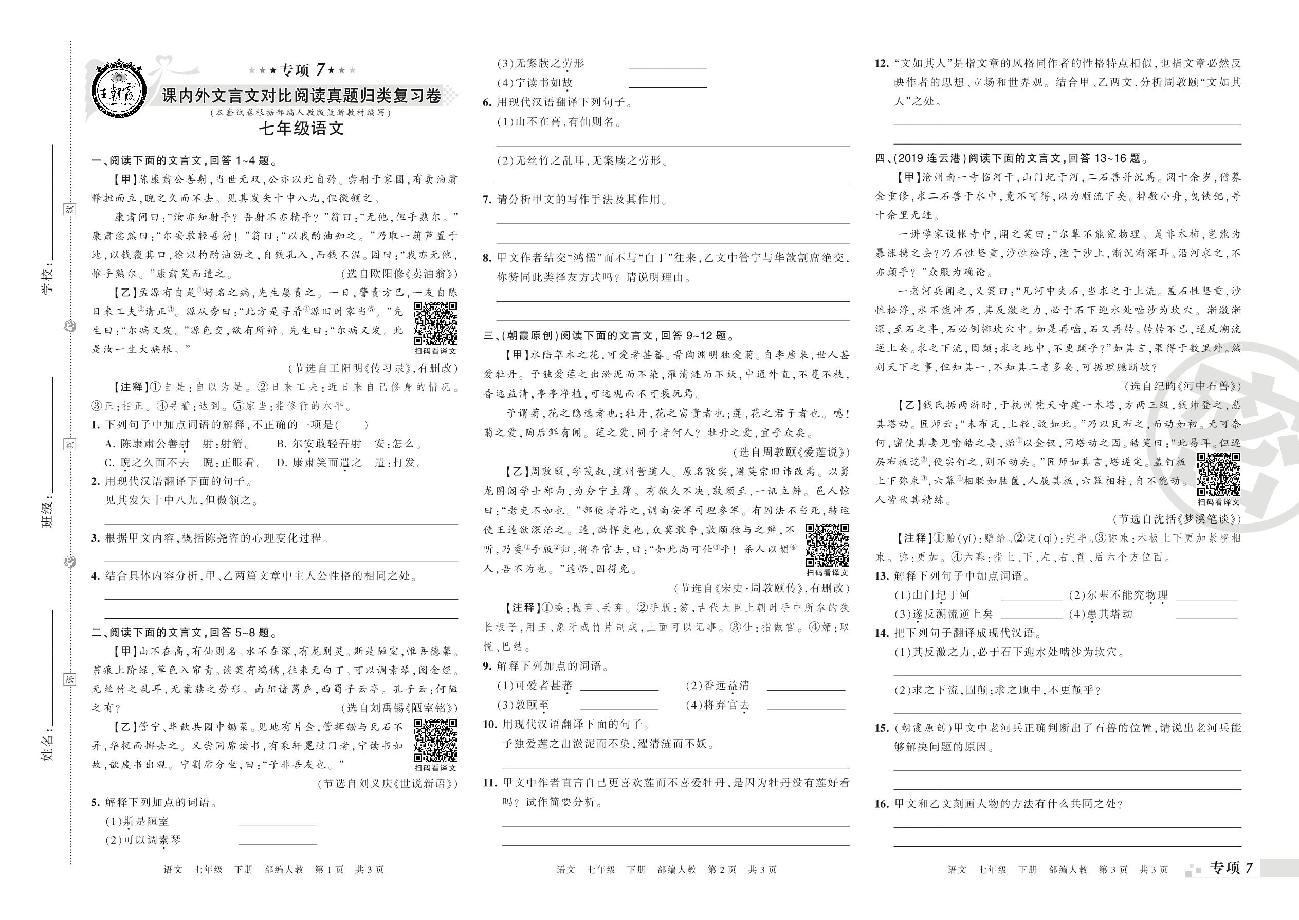 王朝霞期末专项卷——课内外文言文对比阅读、古诗词阅读真题归类复习卷七年级下册语文(人教版)_R21080223156【0】