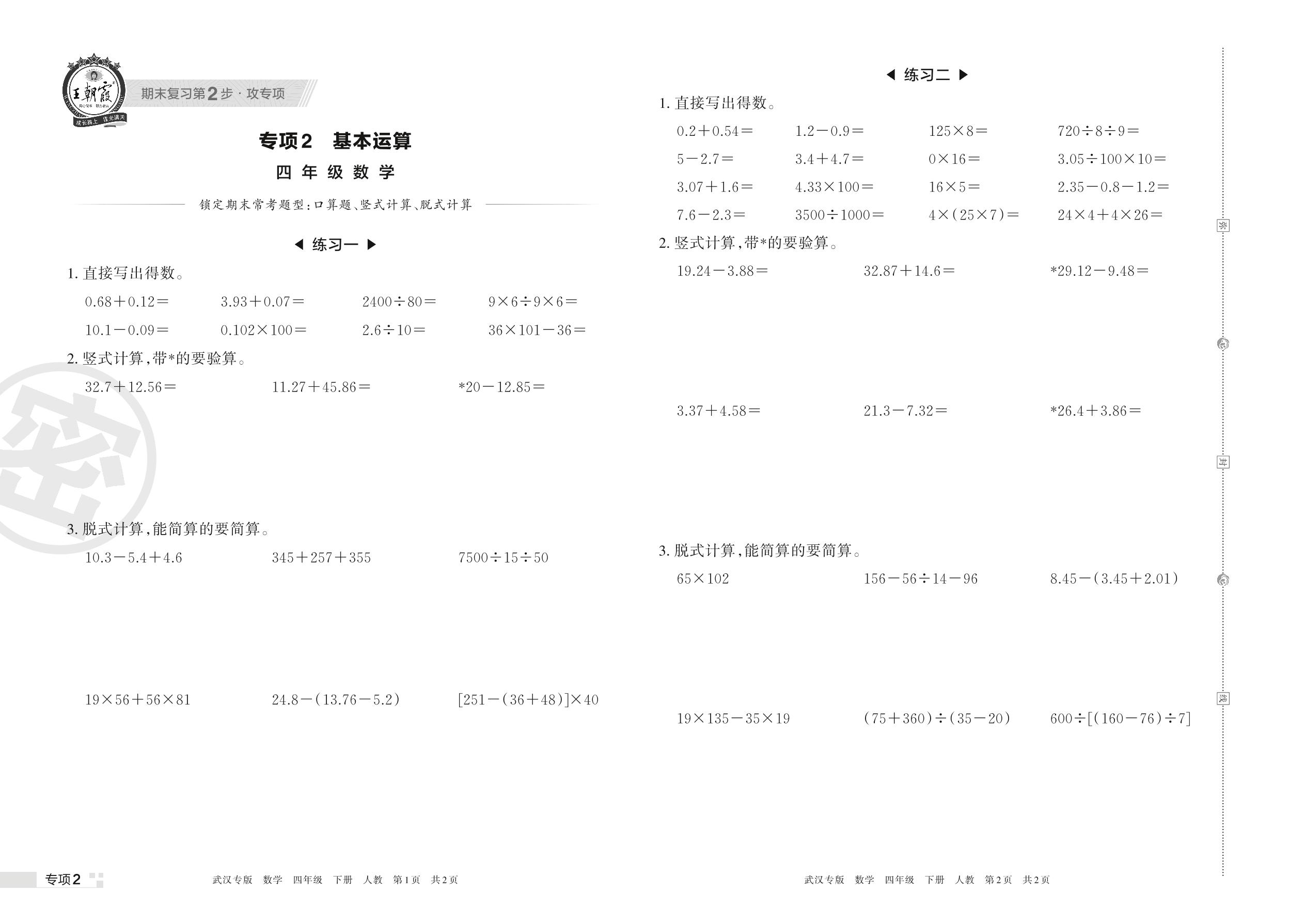 王朝霞期末专项卷——基本运算四年级下册数学(人教版)_R220409172218371【2】