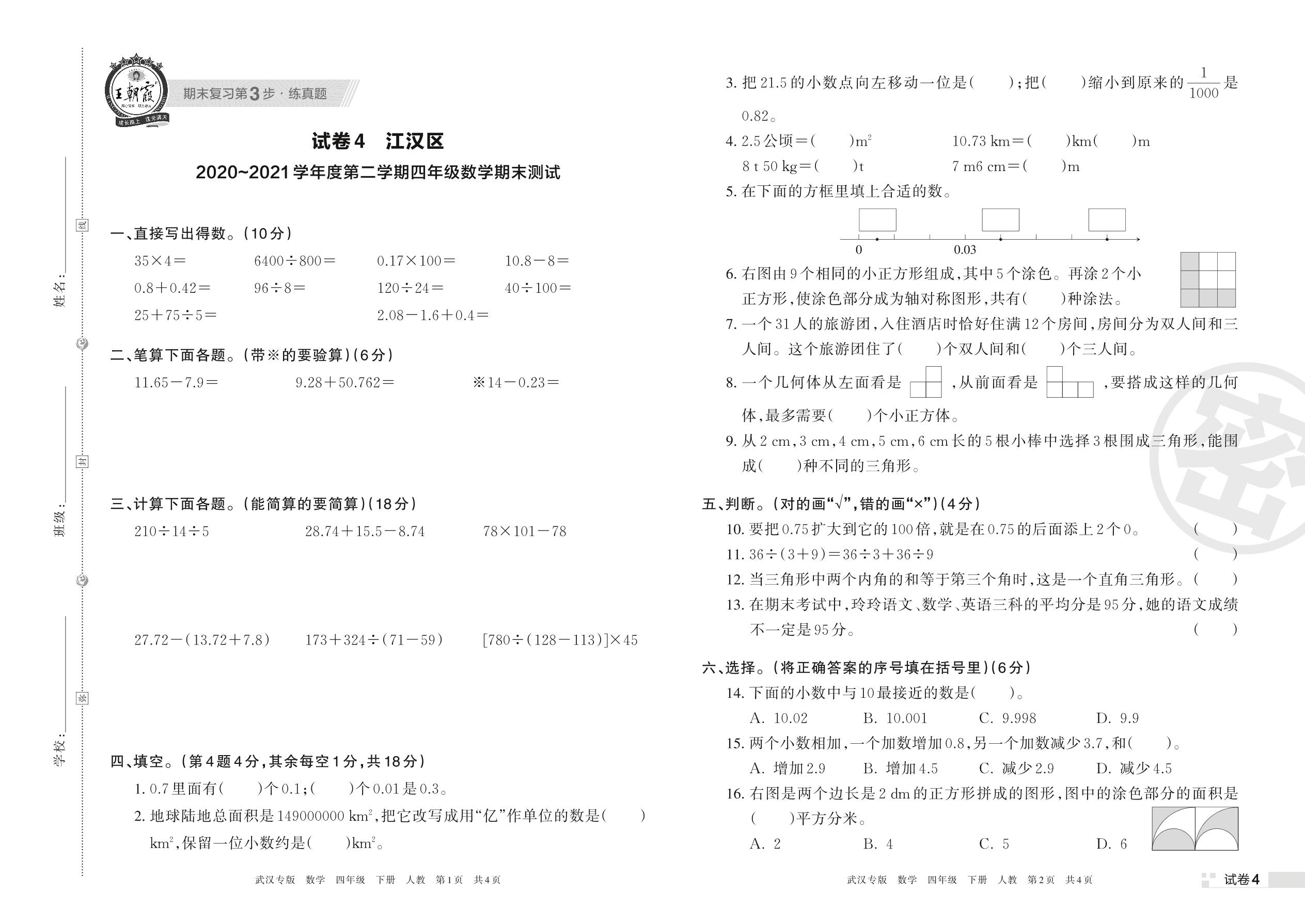 江汉区2020~2021学年度第二学期四年级数学期末测试(人教版)【4】