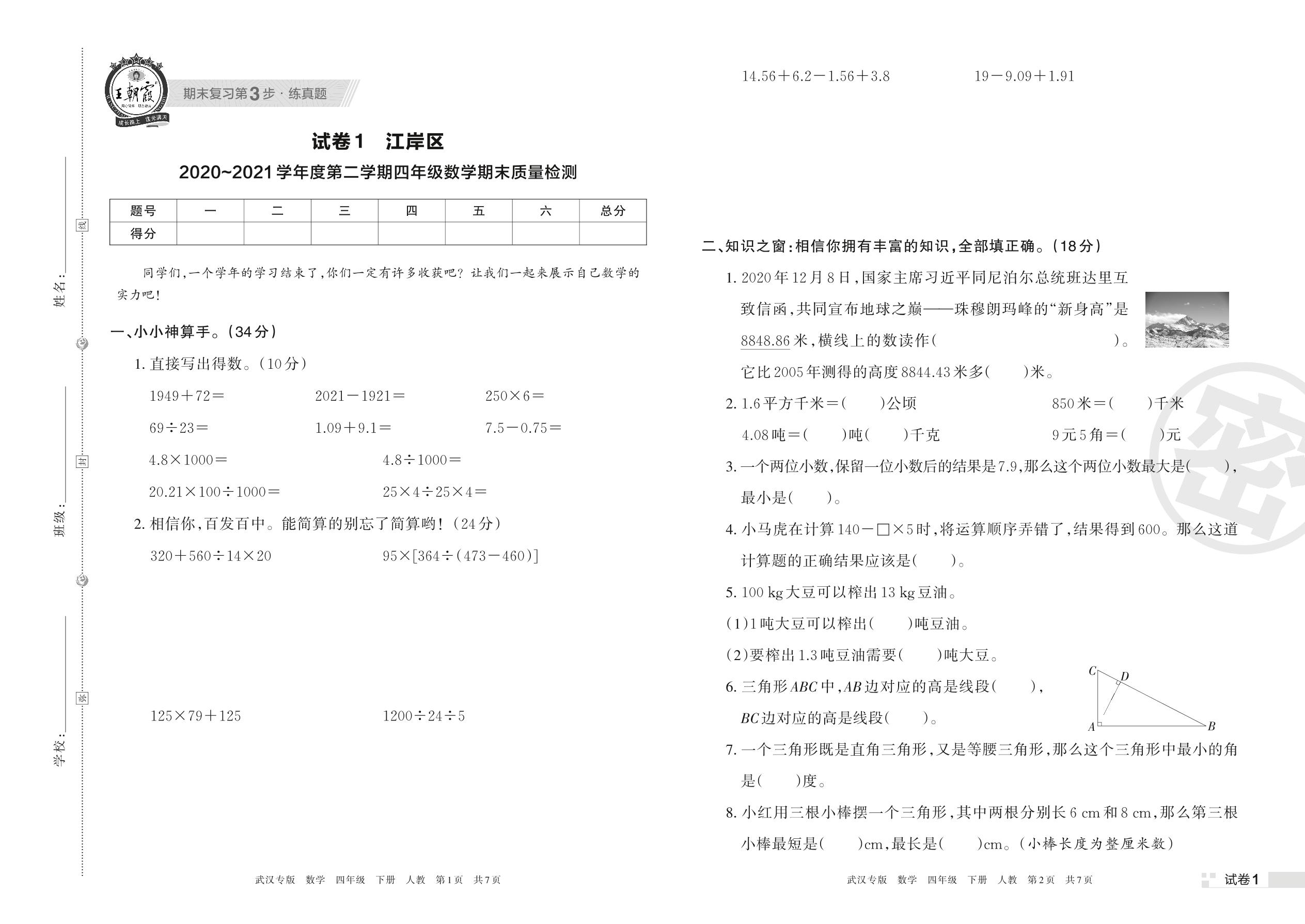 江岸区2020~2021学年度第二学期四年级数学期末质量检测(人教版)【1】
