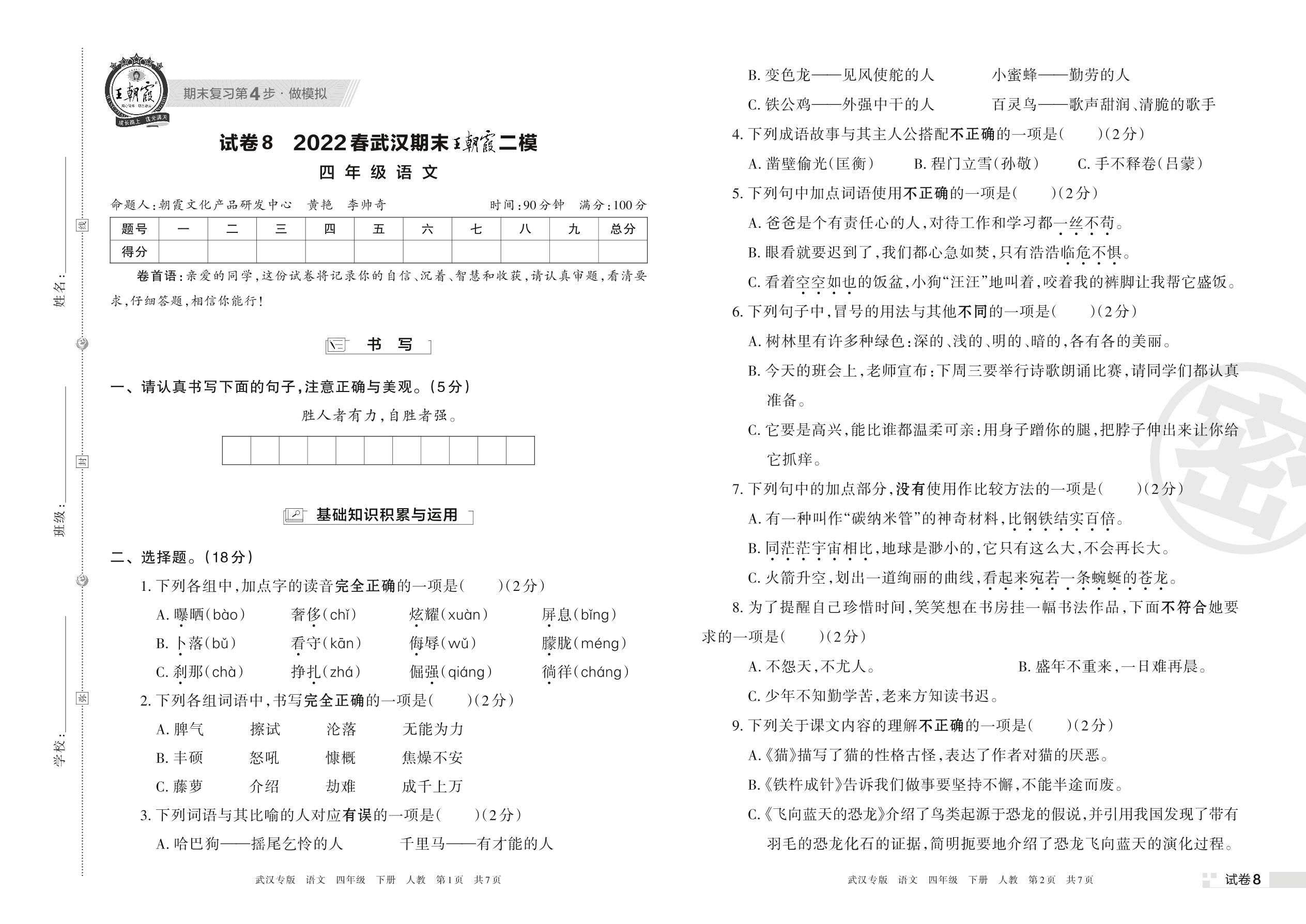 王朝霞期末模拟卷四年级下册语文(人教版)_R220409173047325【8】