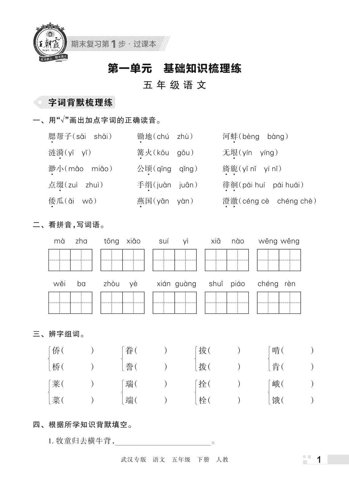 王朝霞期末过课本——第一单元 基础知识梳理练五年级下册语文(人教版)_R220411091343939