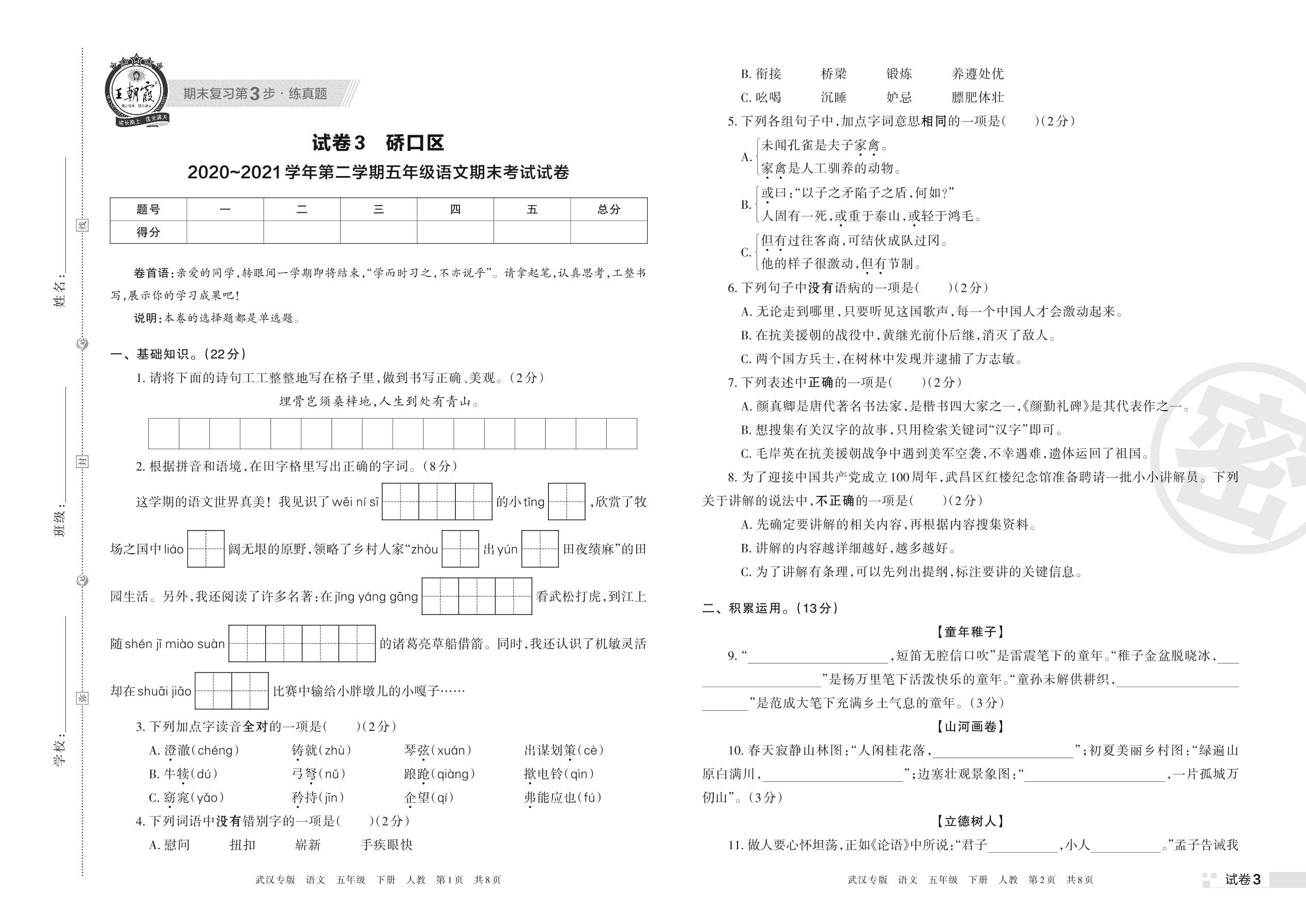 硚口区2020~2021学年第二学期五年级语文期末考试试卷(人教版)【3】