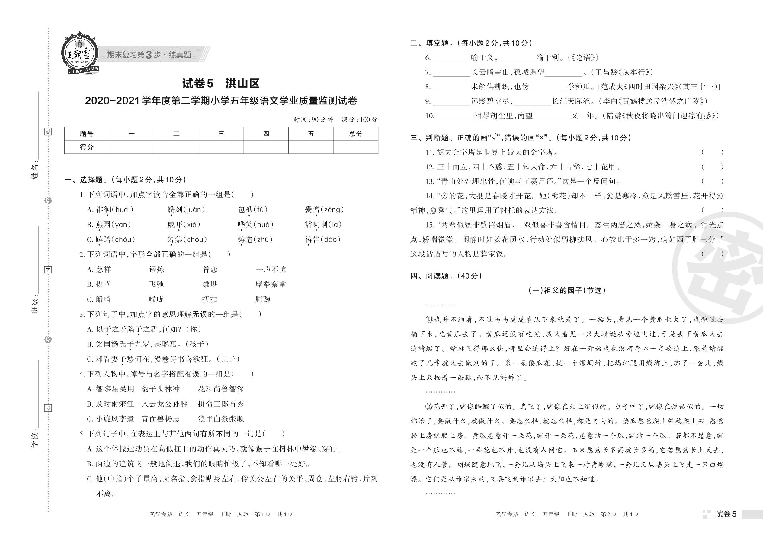 洪山区2020~2021学年度第二学期小学五年级语文学业质量监测试卷(人教版)【5】