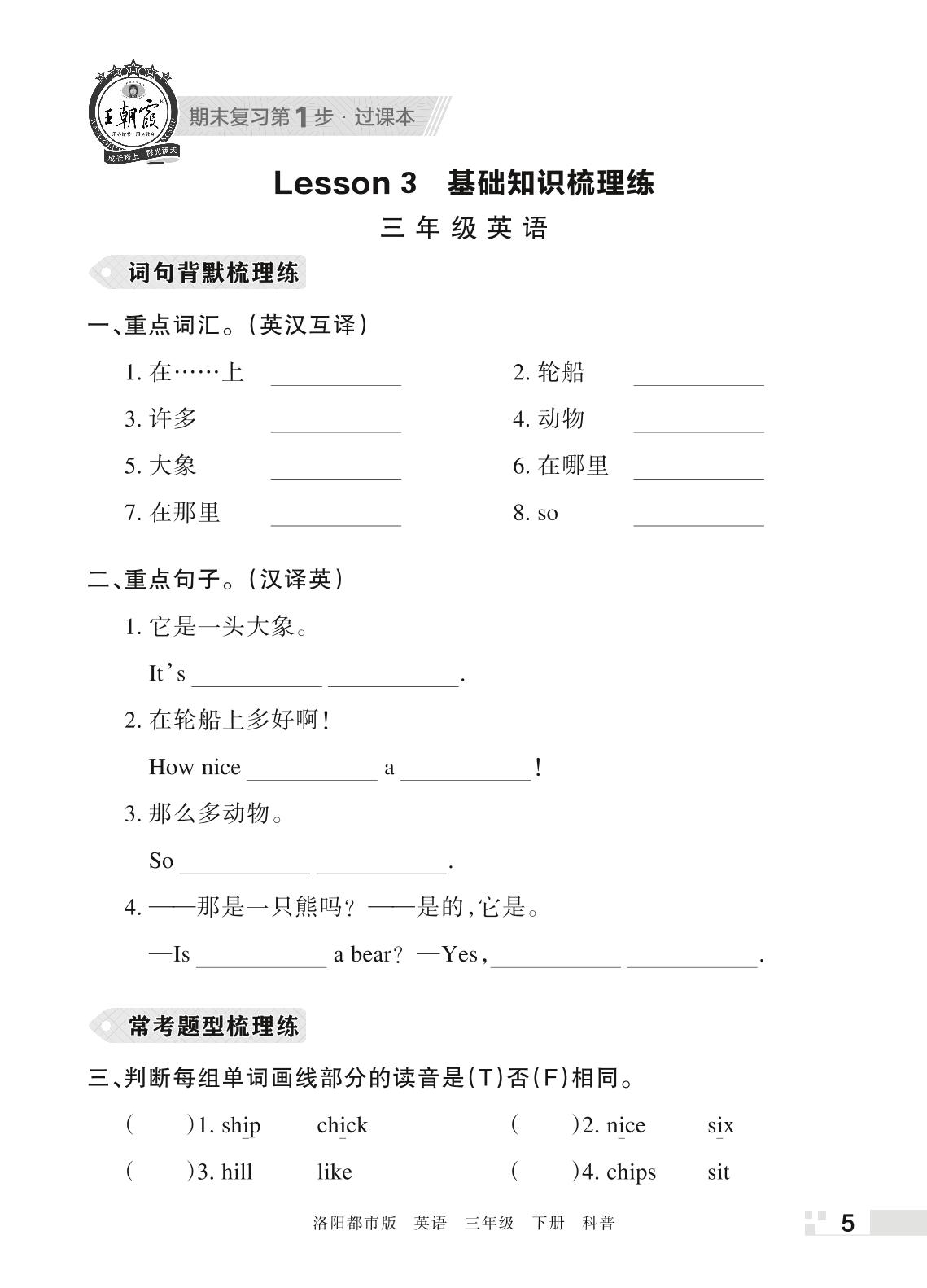 王朝霞期末过课本——Lesson 3 基础知识梳理练三年级下册英语(科普版)