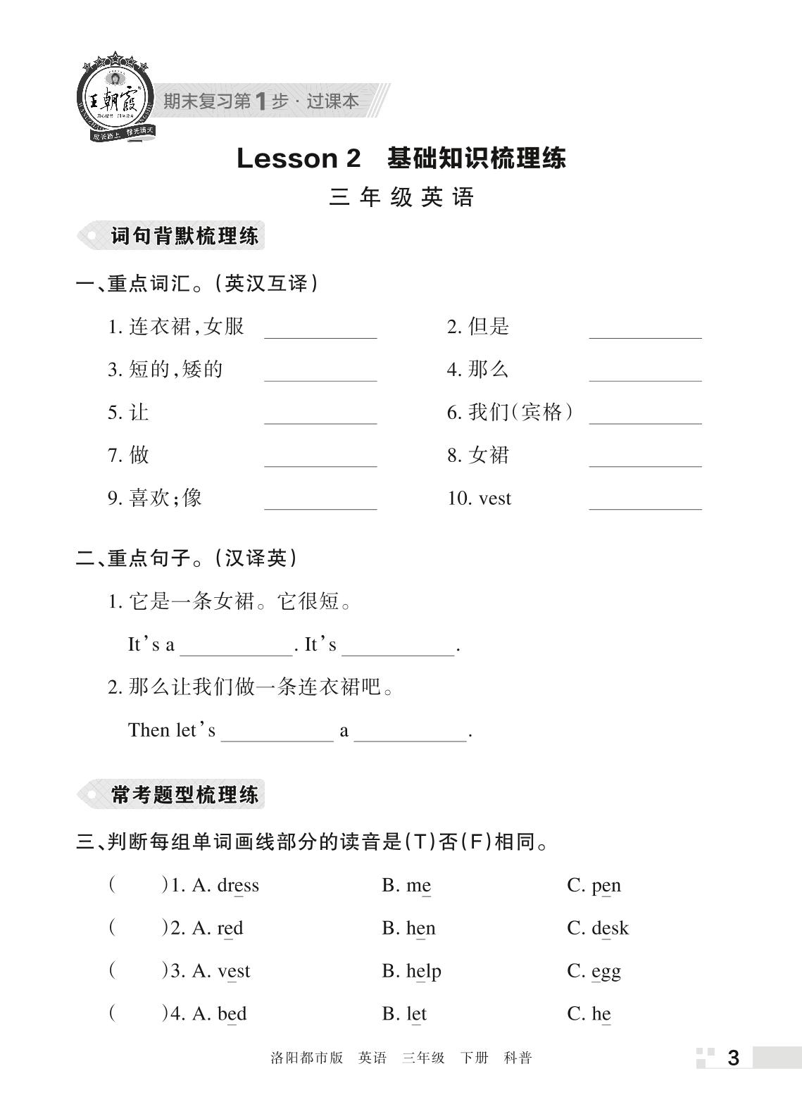 王朝霞期末过课本——Lesson 2 基础知识梳理练三年级下册英语(科普版)