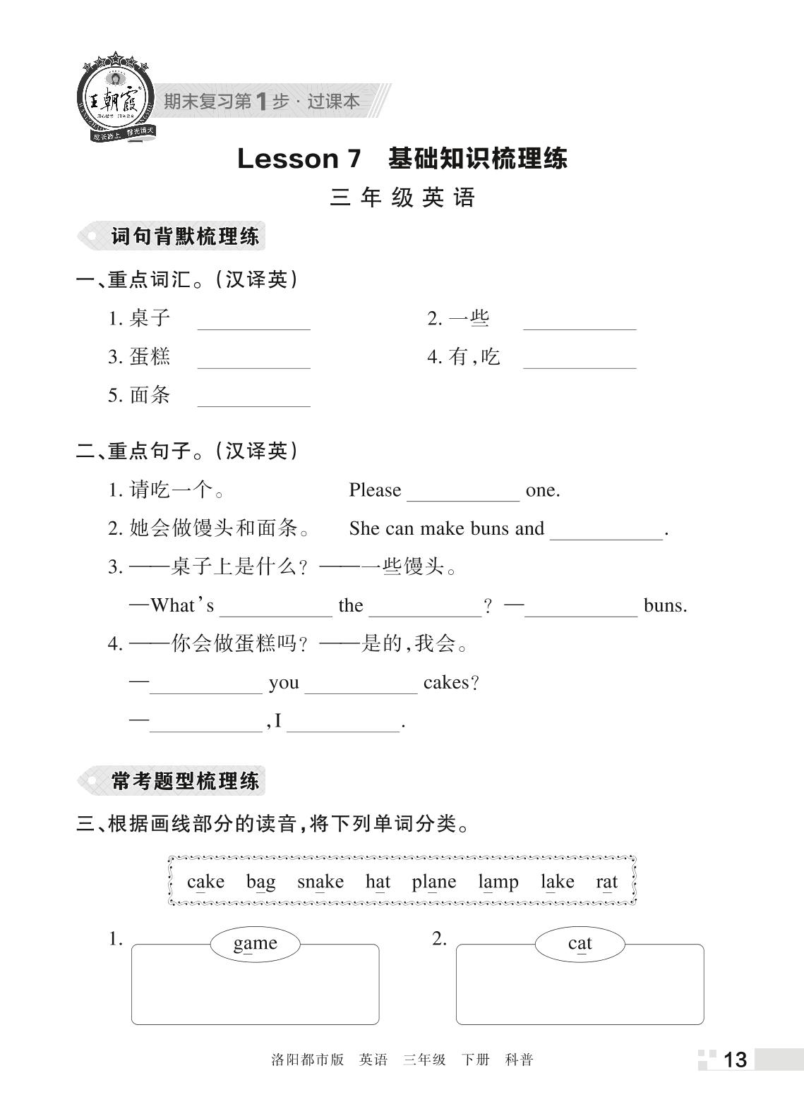王朝霞期末过课本——Lesson 7 基础知识梳理练三年级下册英语(科普版)