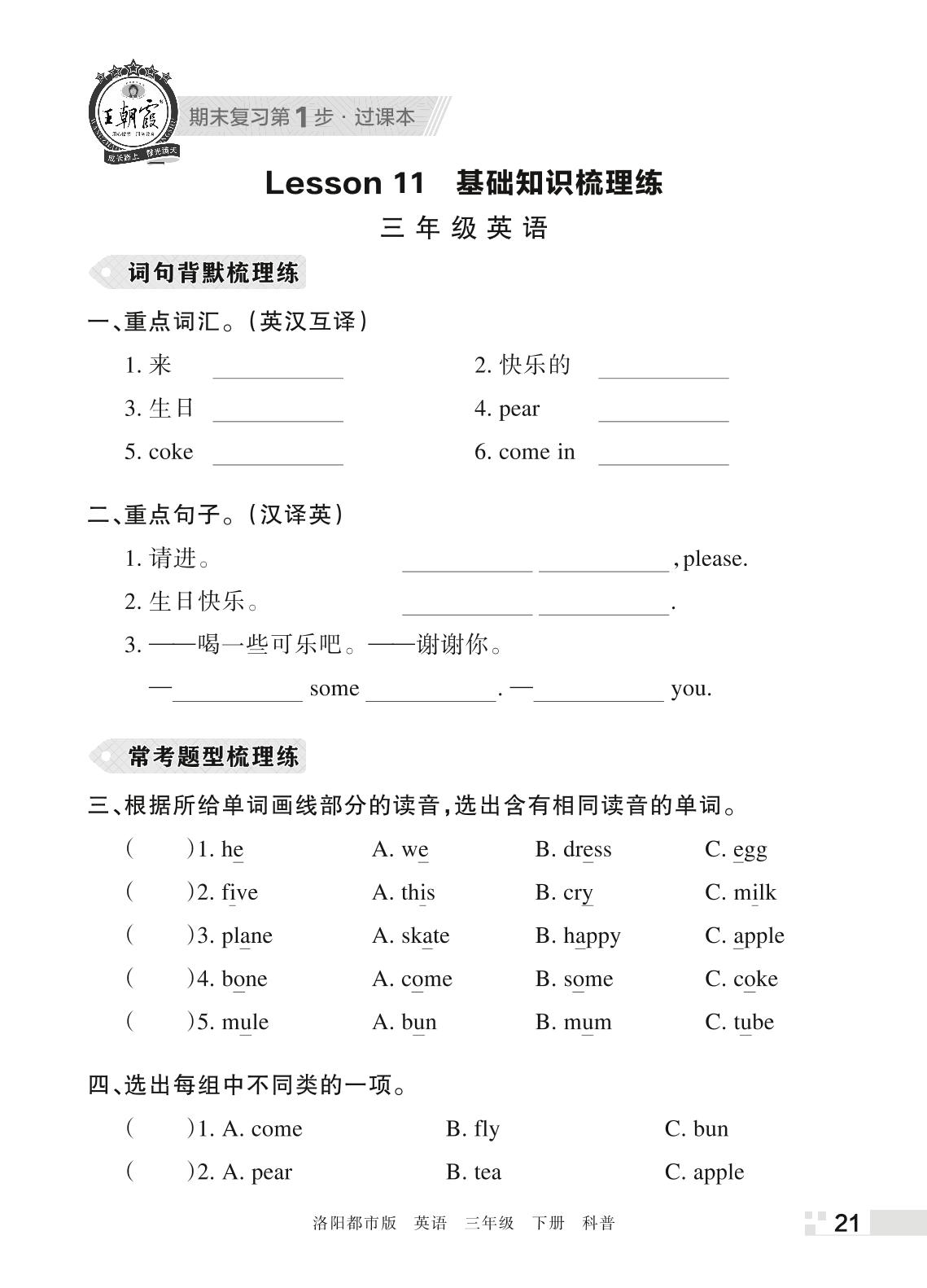 王朝霞期末过课本——Lesson 11 基础知识梳理练三年级下册英语(科普版)