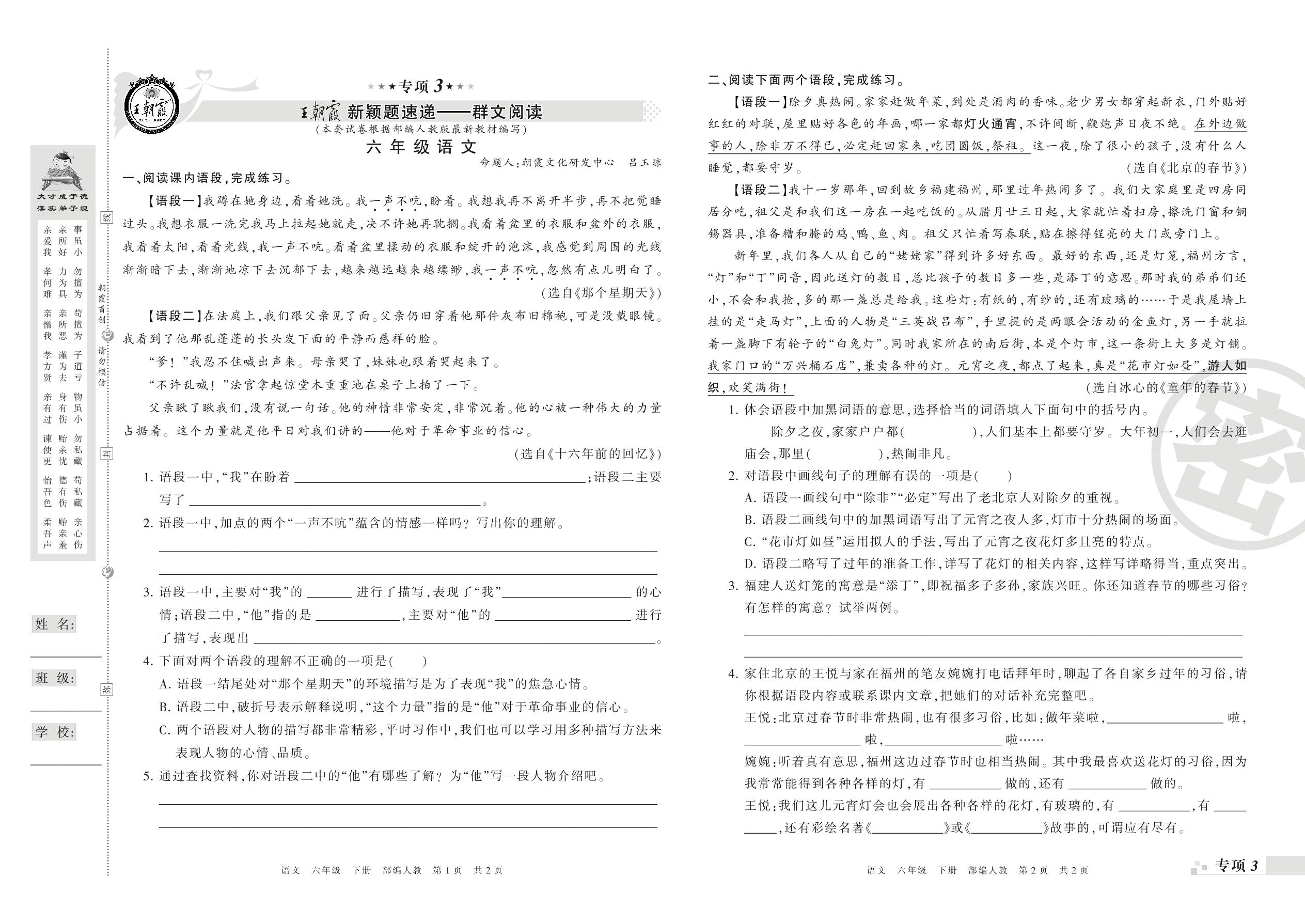 王朝霞期末专项卷——新颖题速递:群文阅读、古诗文阅读六年级下册语文(人教版)_R21080223353【0】