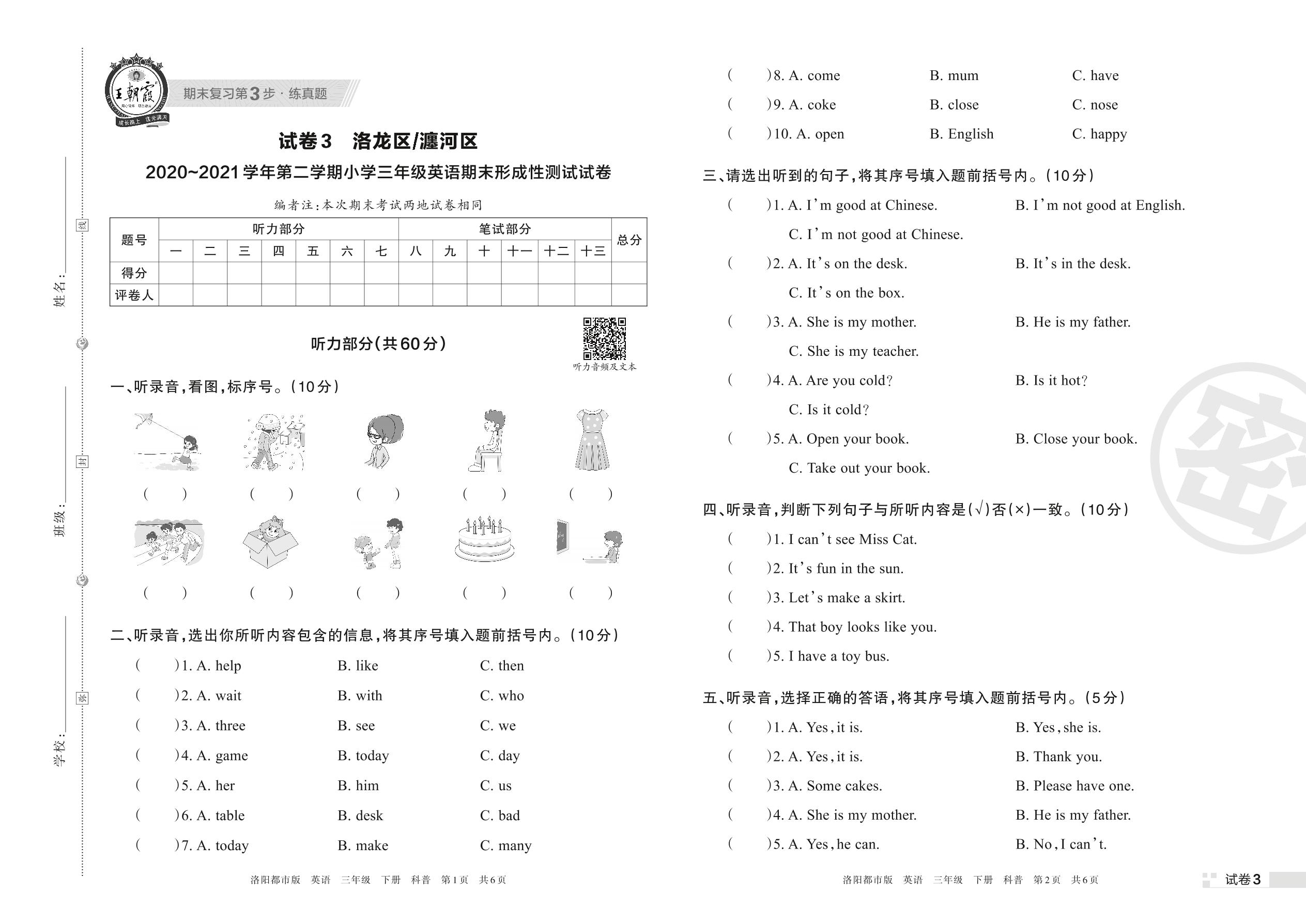 洛龙区、瀍河区2020~2021学年第二学期小学三年级英语期末形成性测试试卷(科普版)【3】