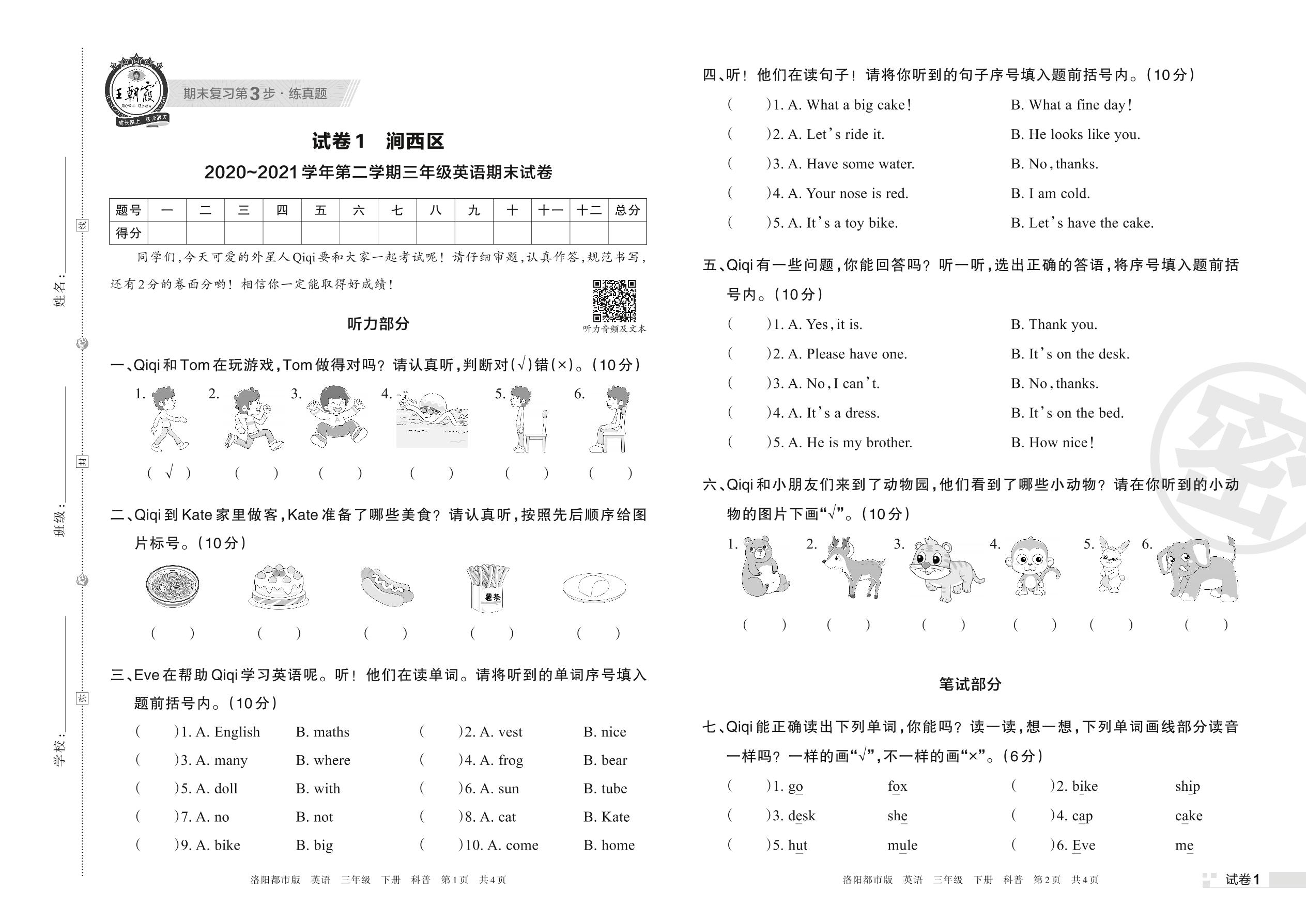 涧西区2020~2021学年第二学期三年级英语期末试卷(科普版)【1】