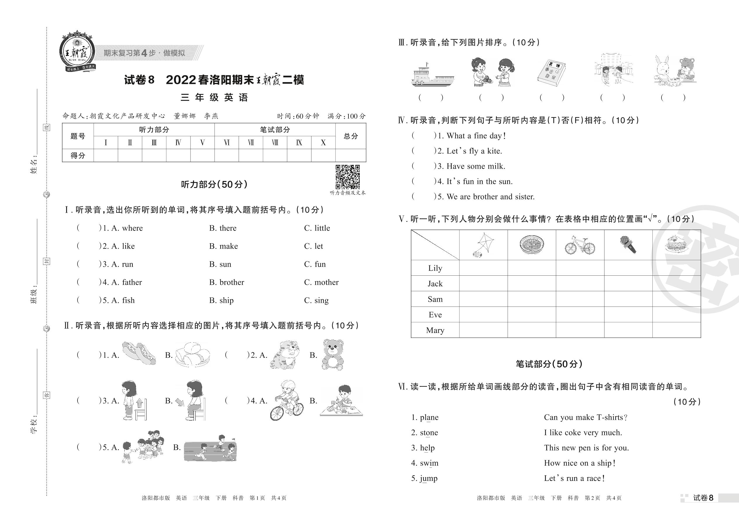 王朝霞期末模拟卷三年级下册英语(科普版)_R220411094702355【8】
