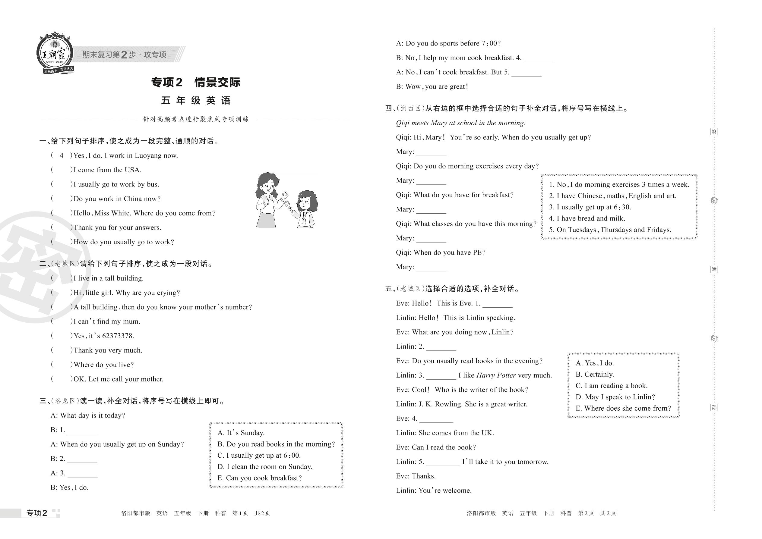 王朝霞期末专项卷——情景交际五年级下册英语(科普版)【2】