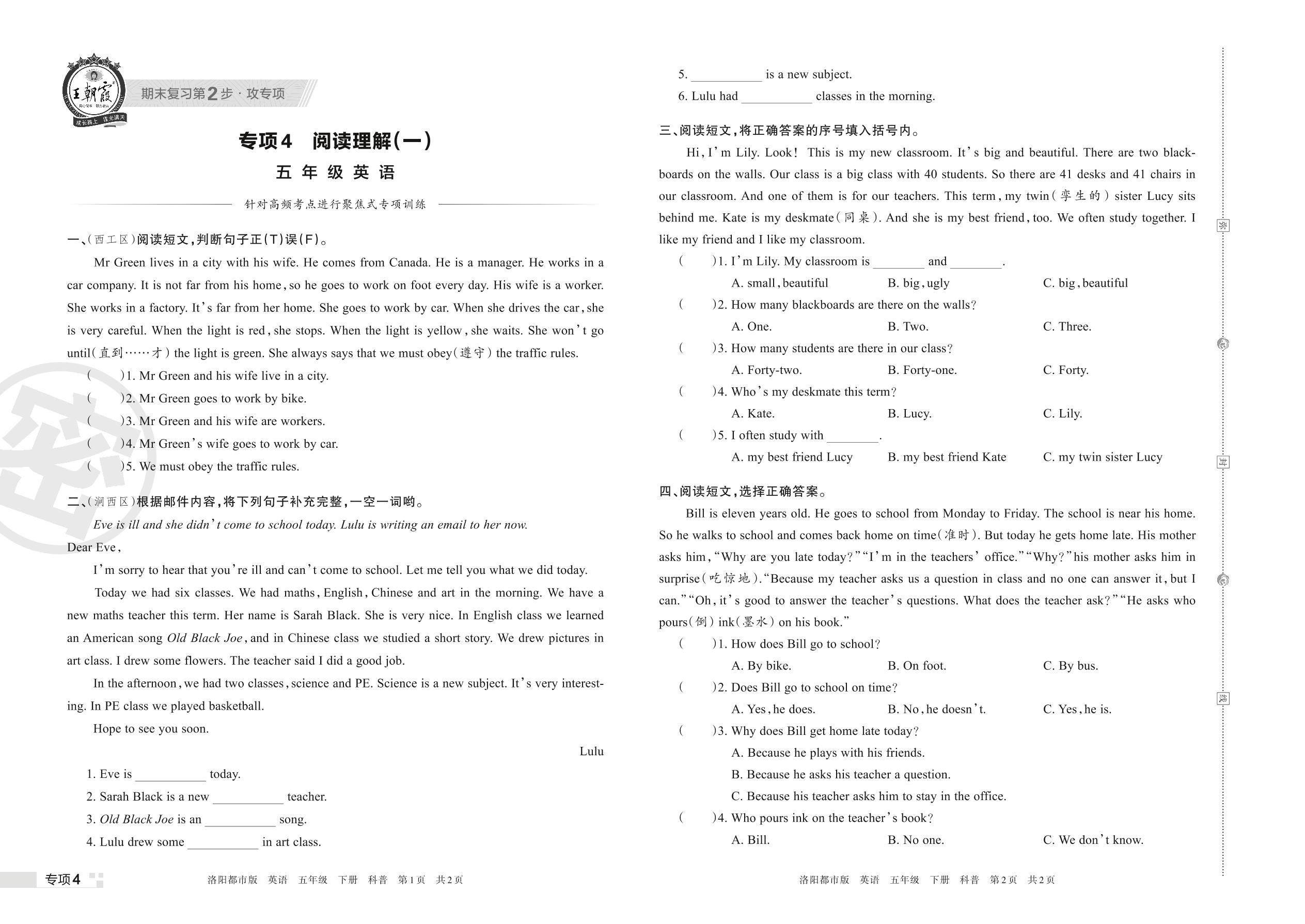 王朝霞期末专项卷——阅读理解(一)五年级下册英语(科普版)【4】