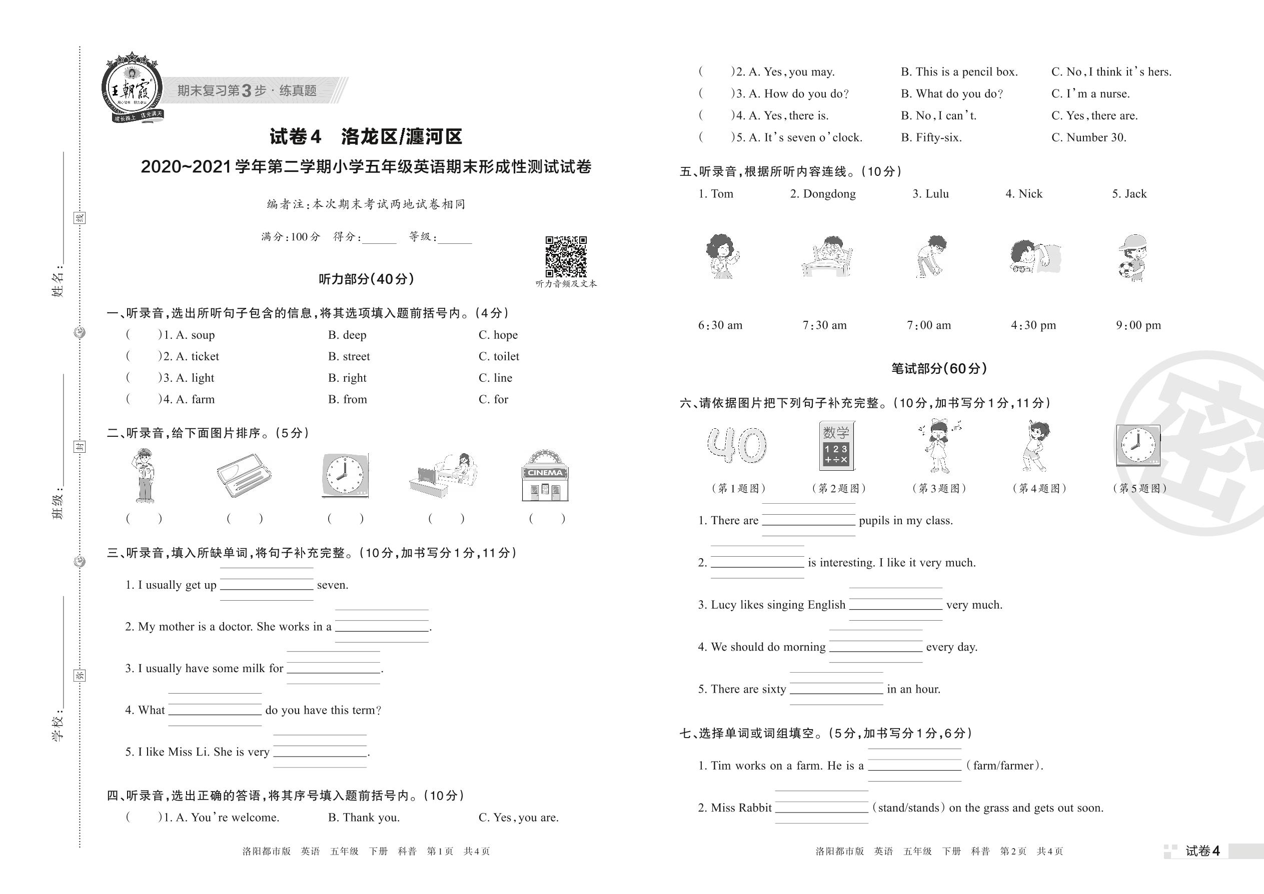 洛龙区、瀍河区2020~2021学年第二学期小学五年级英语期末形成性测试试卷(科普版)【4】