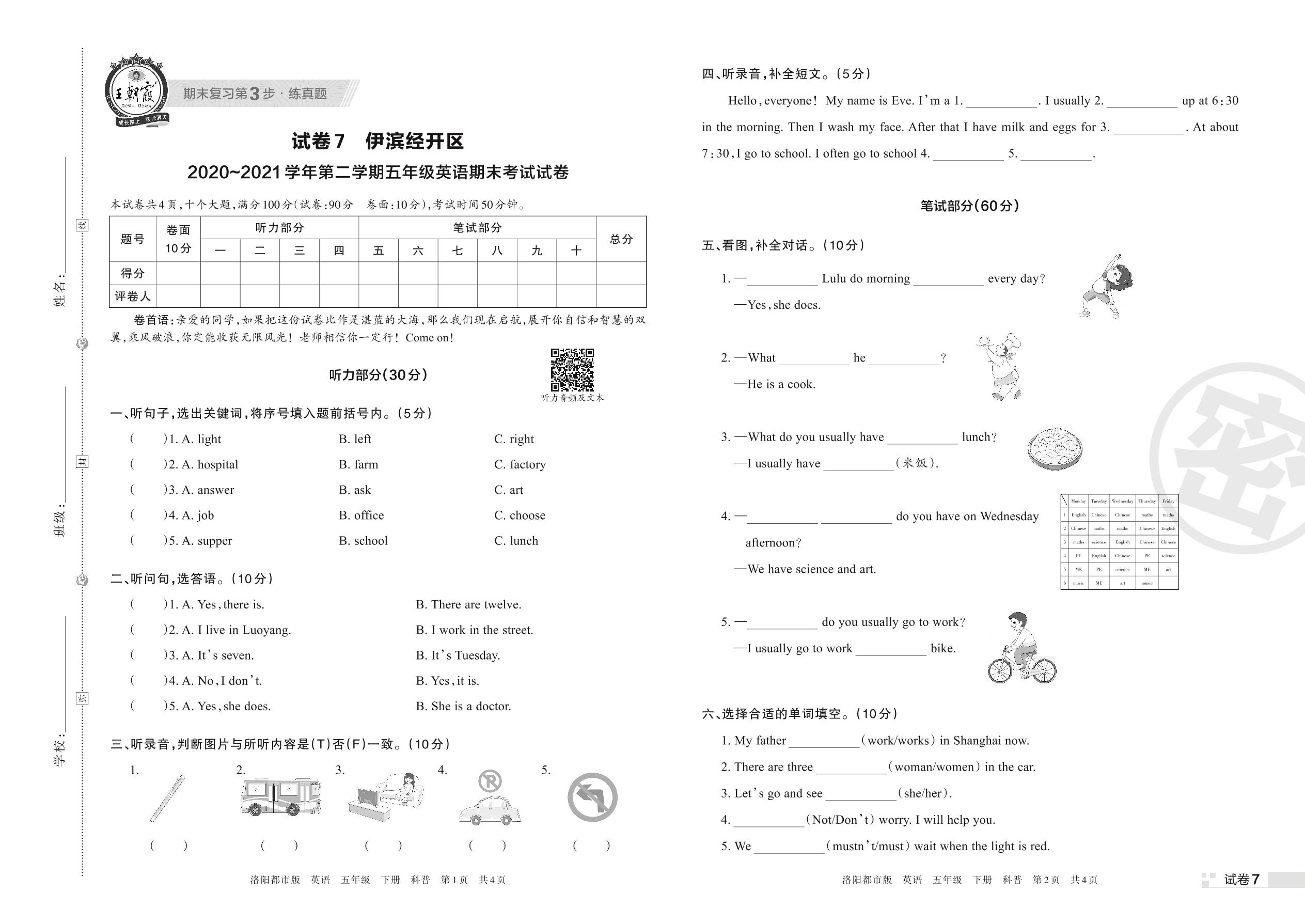 伊滨经开区2020~2021学年第二学期五年级英语期末考试试卷(科普版)【7】