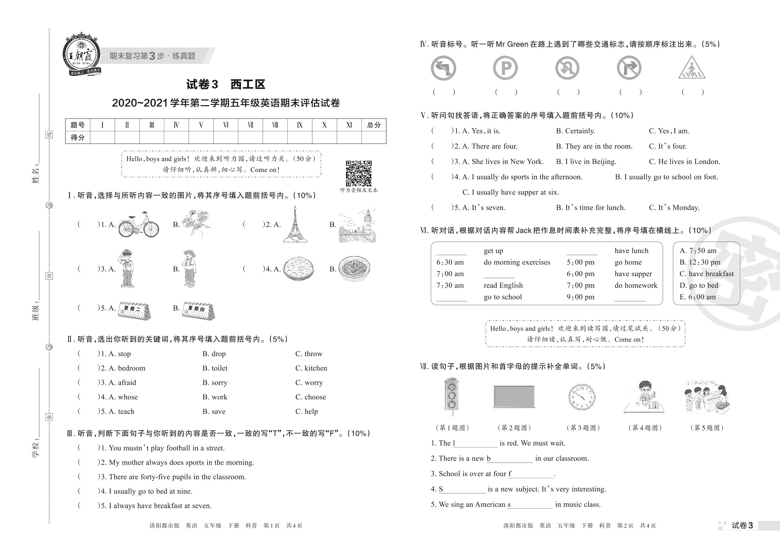 西工区2020~2021学年第二学期五年级英语期末评估试卷(科普版)【3】