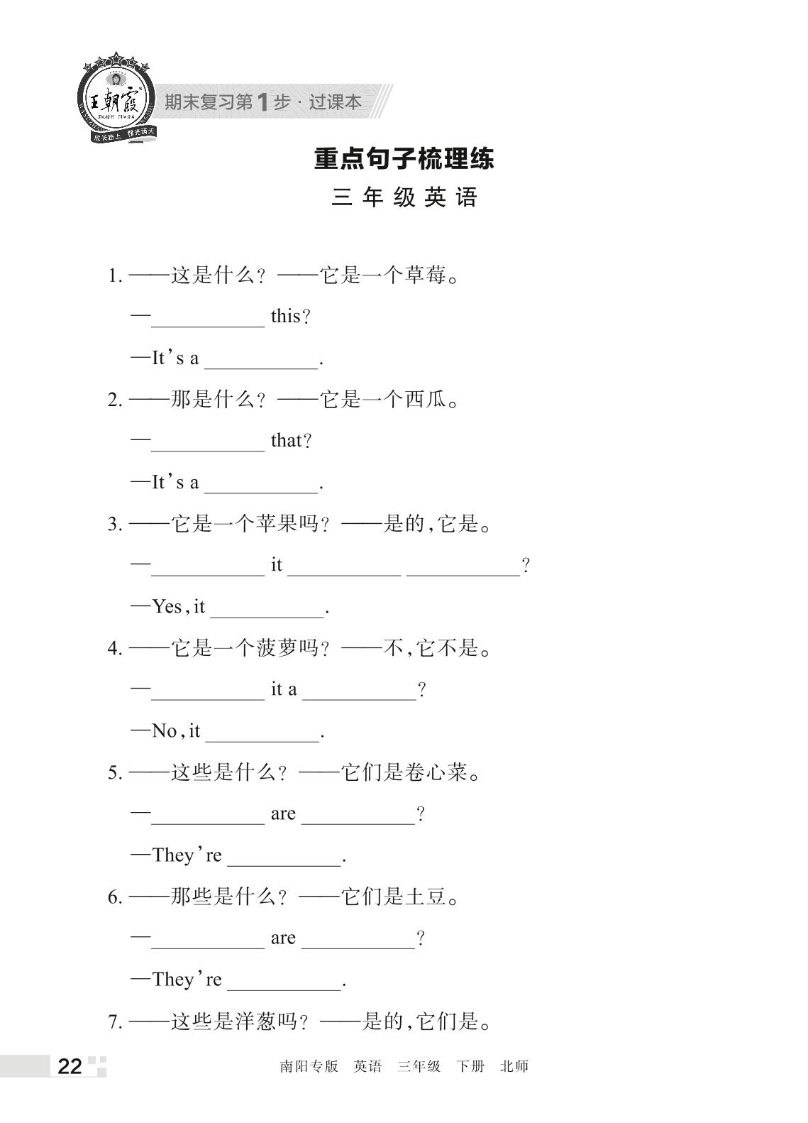 王朝霞期末过课本——重点句子梳理练三年级下册英语(北师版)