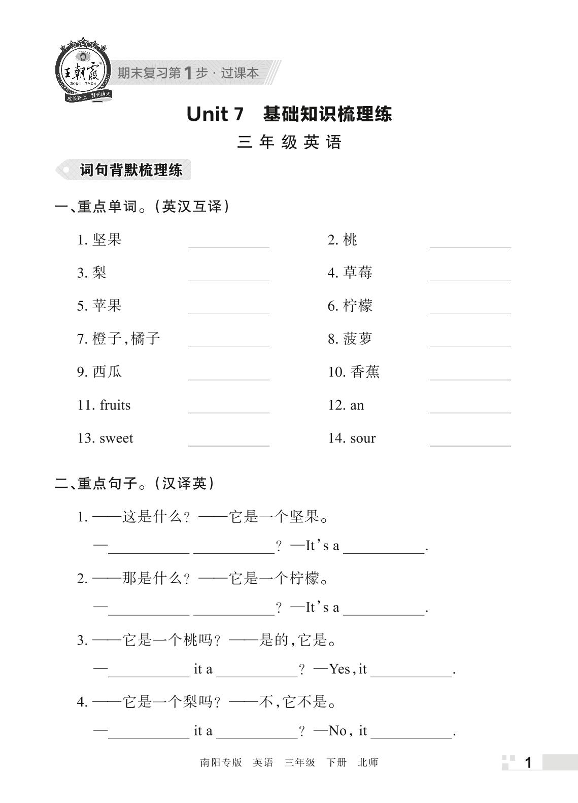 王朝霞期末过课本——Unit 7 基础知识梳理练三年级下册英语(北师版)