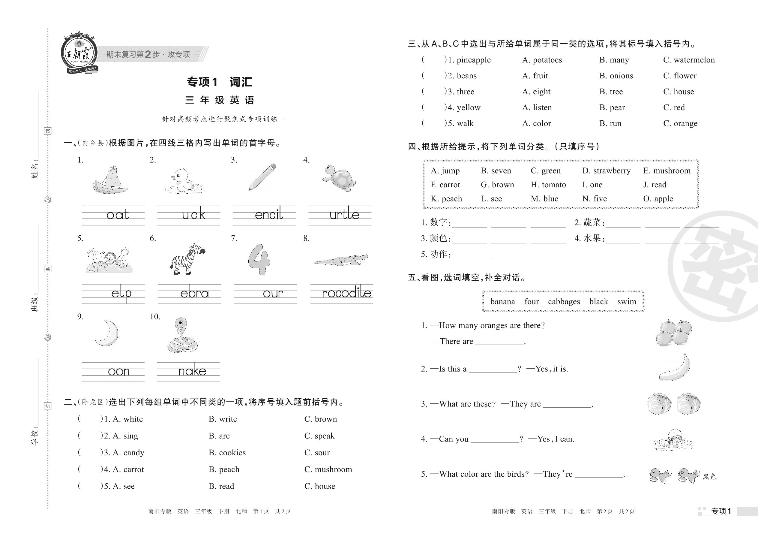 王朝霞期末专项卷——词汇三年级下册英语(北师版)【1】