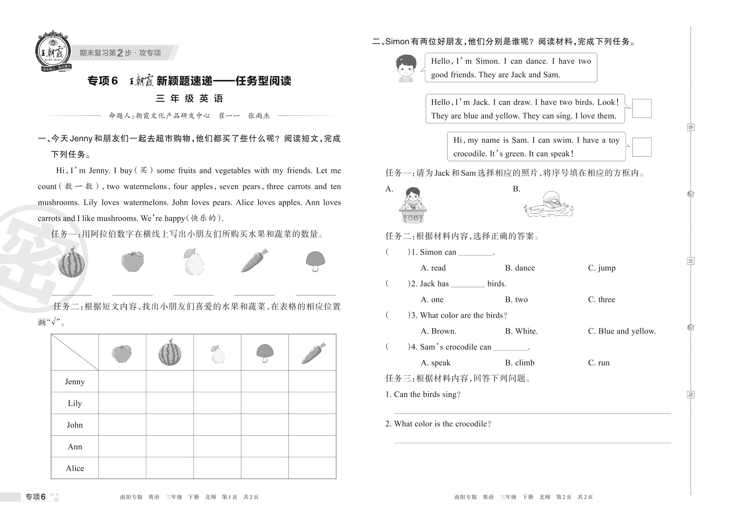 王朝霞期末专项卷——新颖题速递:任务型阅读三年级下册英语(北师版)【6】