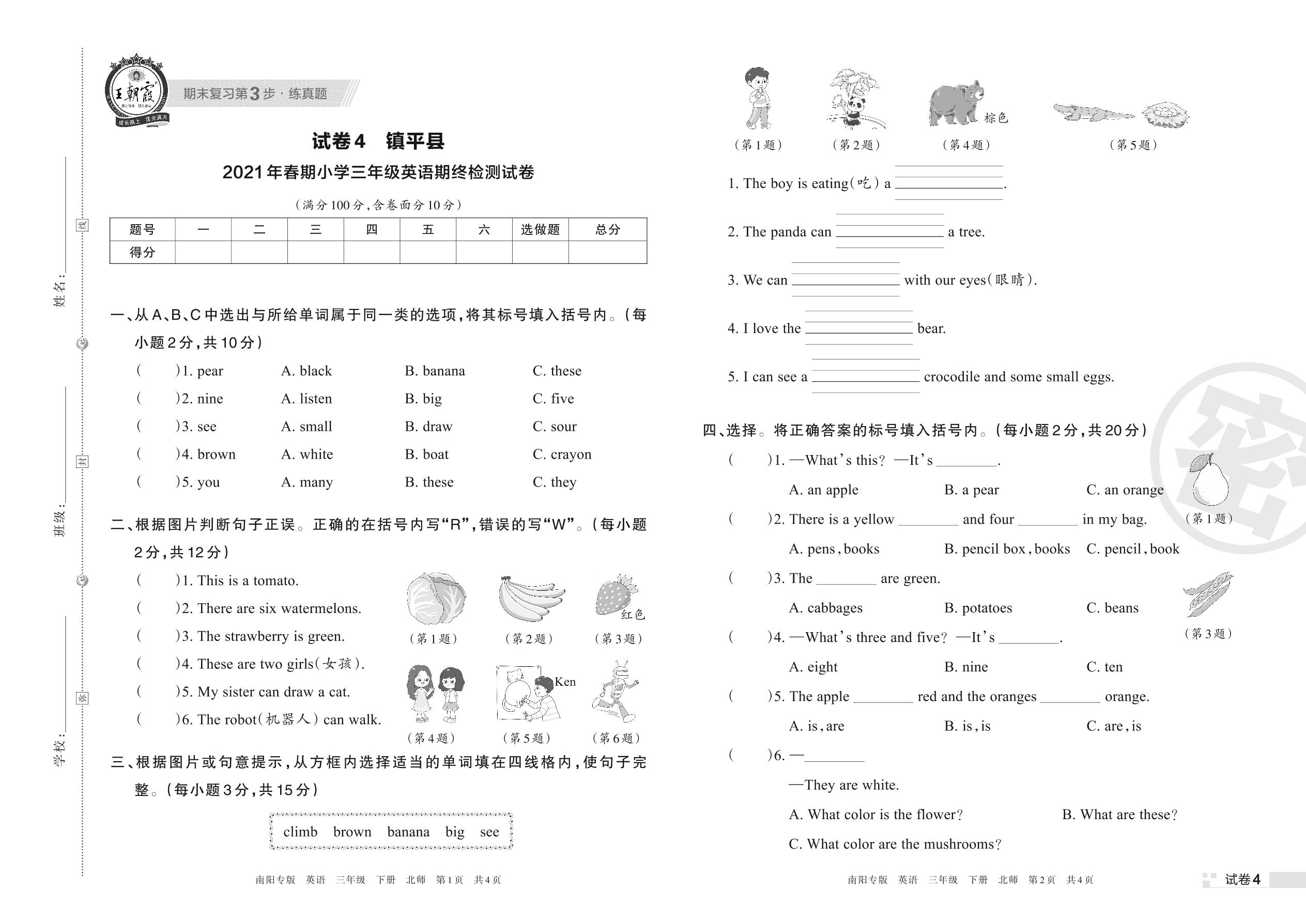 镇平县2021年春期小学三年级英语期终检测试卷(北师版)【4】