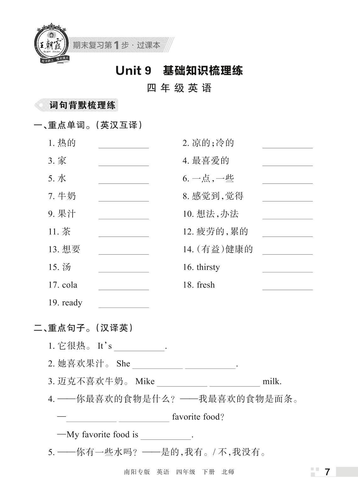 王朝霞期末过课本——Unit 9 基础知识梳理练四年级下册英语(北师版)
