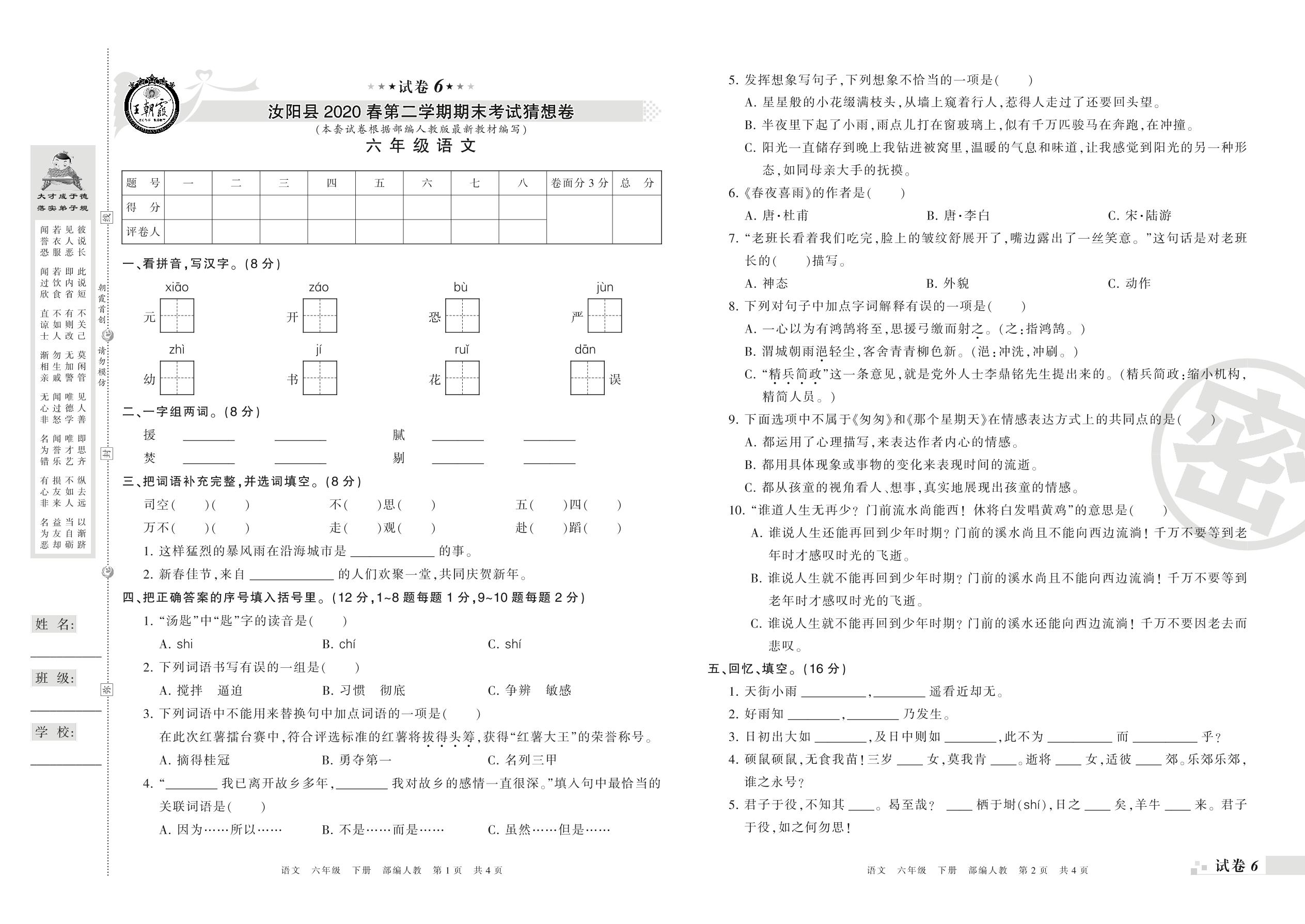 2018-2019学年第二学期洛阳市汝阳县猜想卷六年级语文试卷(人教版)【6】
