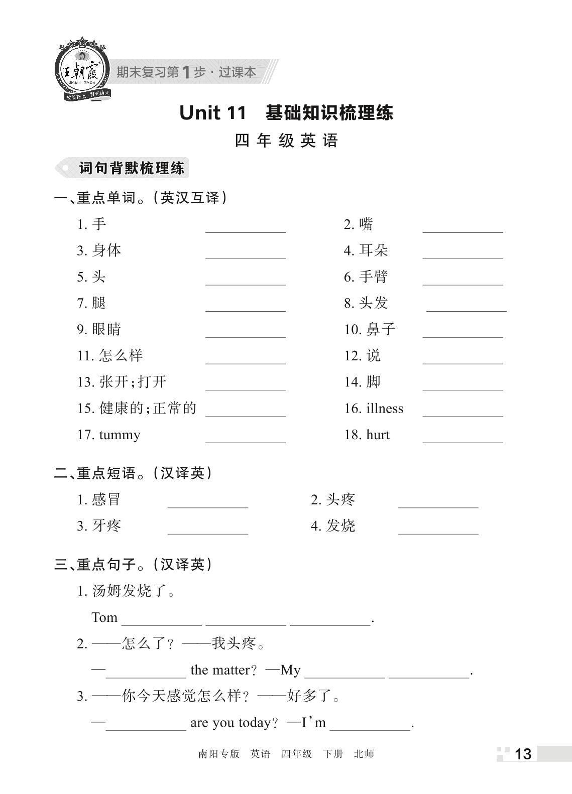 王朝霞期末过课本——Unit 11 基础知识梳理练四年级下册英语(北师版)